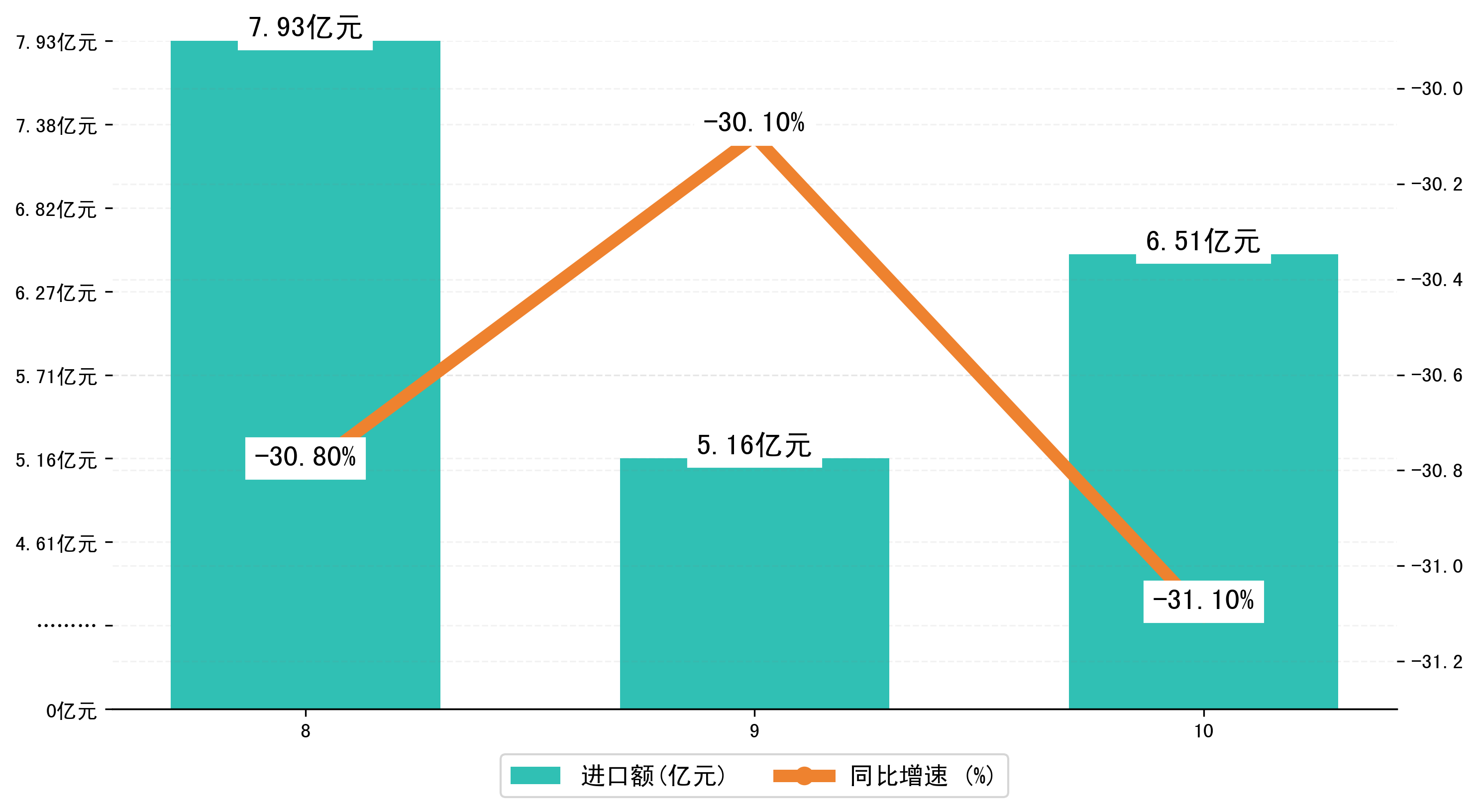 以美元计,2024年10月宜宾市进口额为9206.3402万美元,相比上月增加了1965.0433万美元;相比上年同期减少了1,0177.2742万美元,同比减少-32.50%。