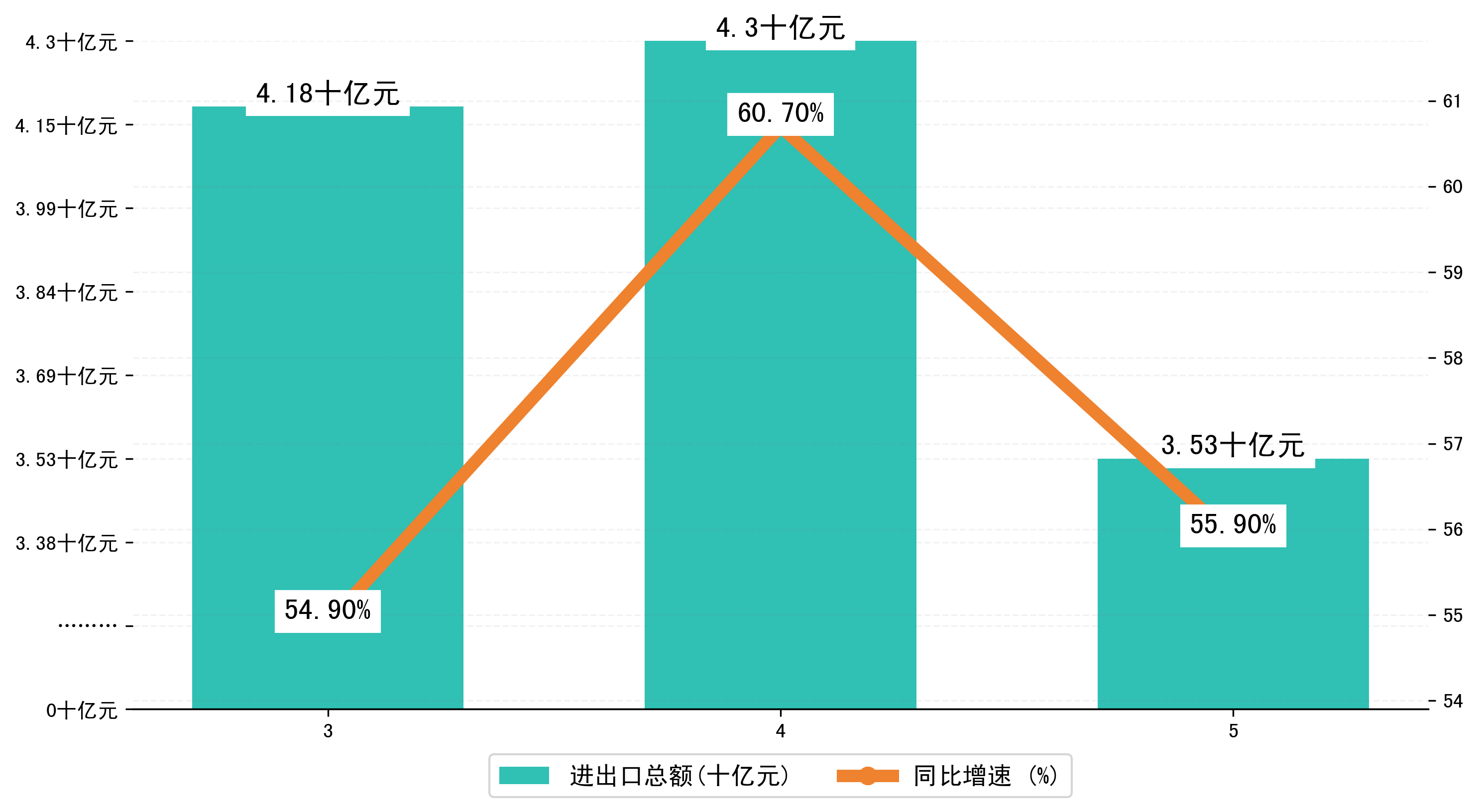 以人民币计,2023年5月宜宾市进出口总额为35,3041.3457万元,相比上月减少了7,7374.9231万元;相比上年同期增加了10,0931.2526万元,同比增加了55.90%。