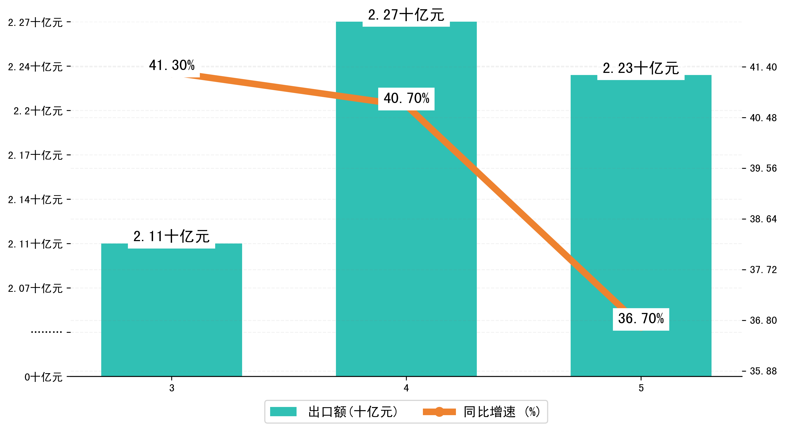 以美元计,2023年1-5月宜宾市出口额为14,0850.813万美元,相比上年同期增加了2,9870.401万美元,同比增加26.90%。
