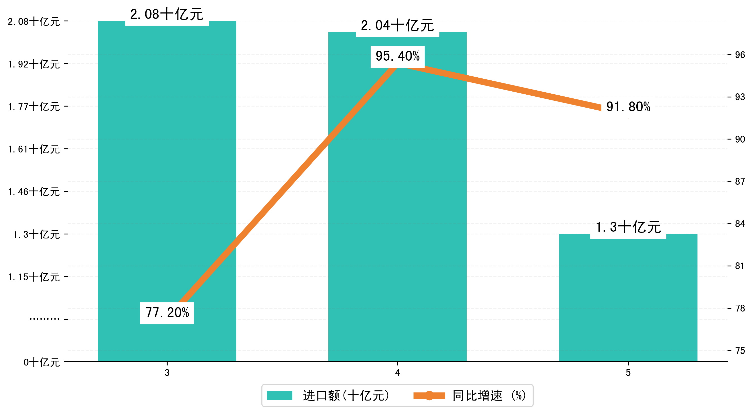 以人民币计,2023年5月宜宾市进口额为13,0180.486万元,相比上月减少了7,3452.415万元;相比上年同期增加了5,6498.2262万元,同比增加了91.80%。