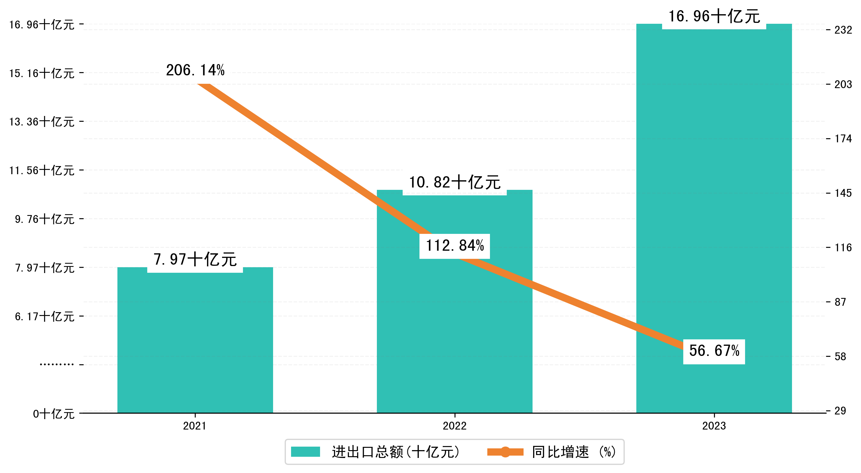 以人民币计,2023年1-5月宜宾市进出口总额为169,5509.1492万元,相比上年同期增加了61,3261.6565万元,同比增加了55.90%。