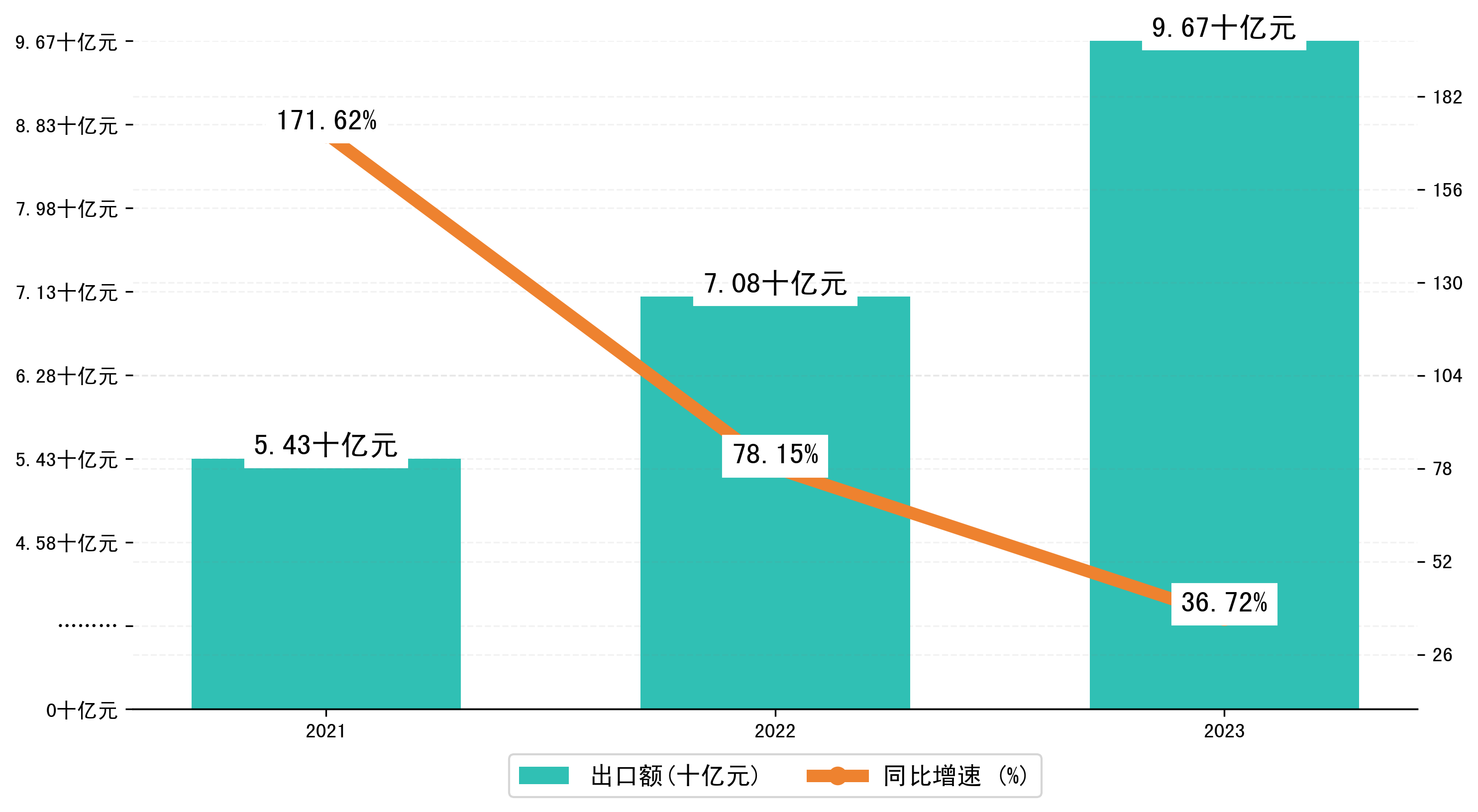 以人民币计,2023年1-5月宜宾市出口额为96,7431.9672万元,相比上年同期增加了25,9822.5432万元,同比增加了36.70%。