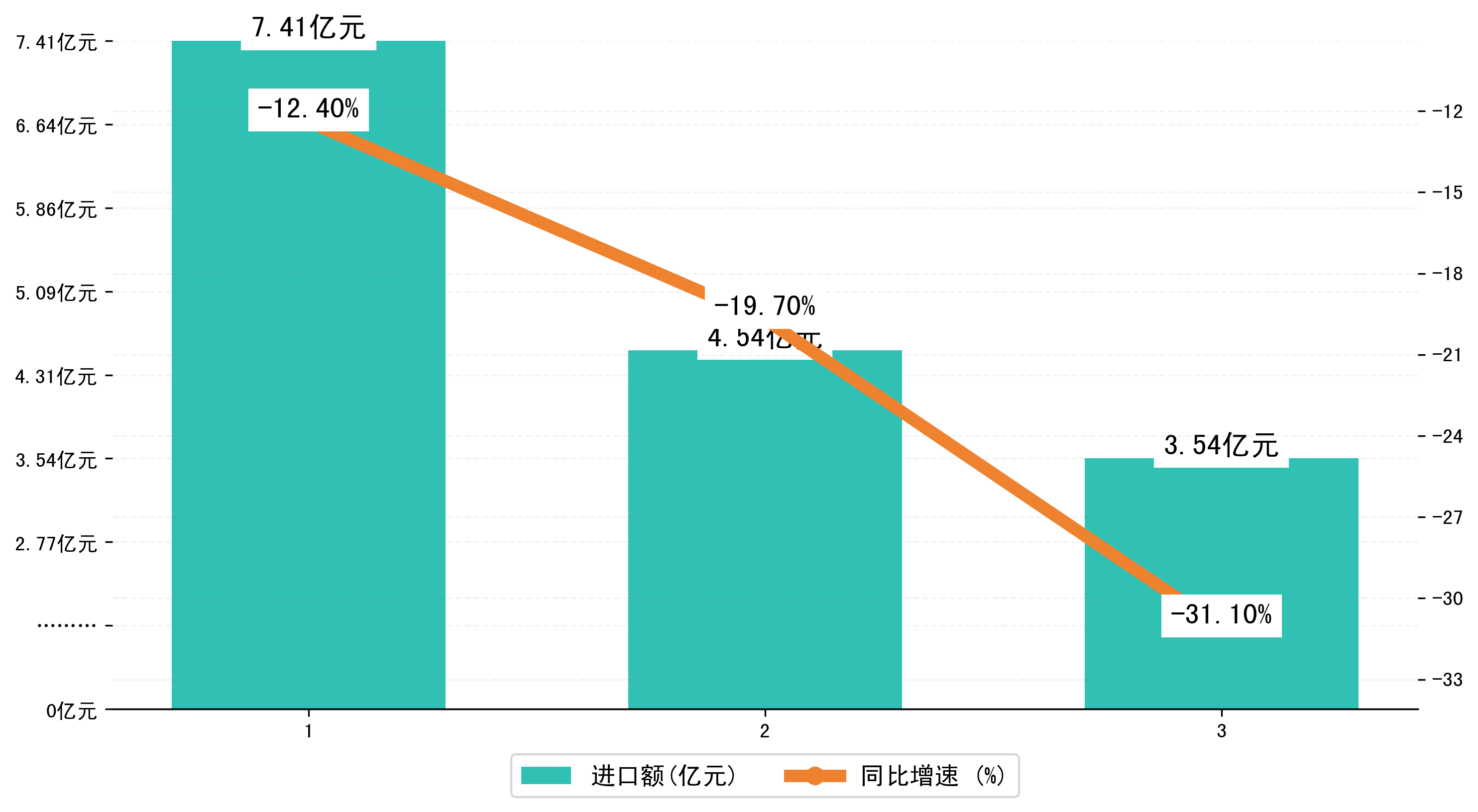 以人民币计,2025年1-3月宜宾市进口额为15,4698.8458万元,相比上年同期减少了9,5923.0054万元,同比减少了-31.10%。