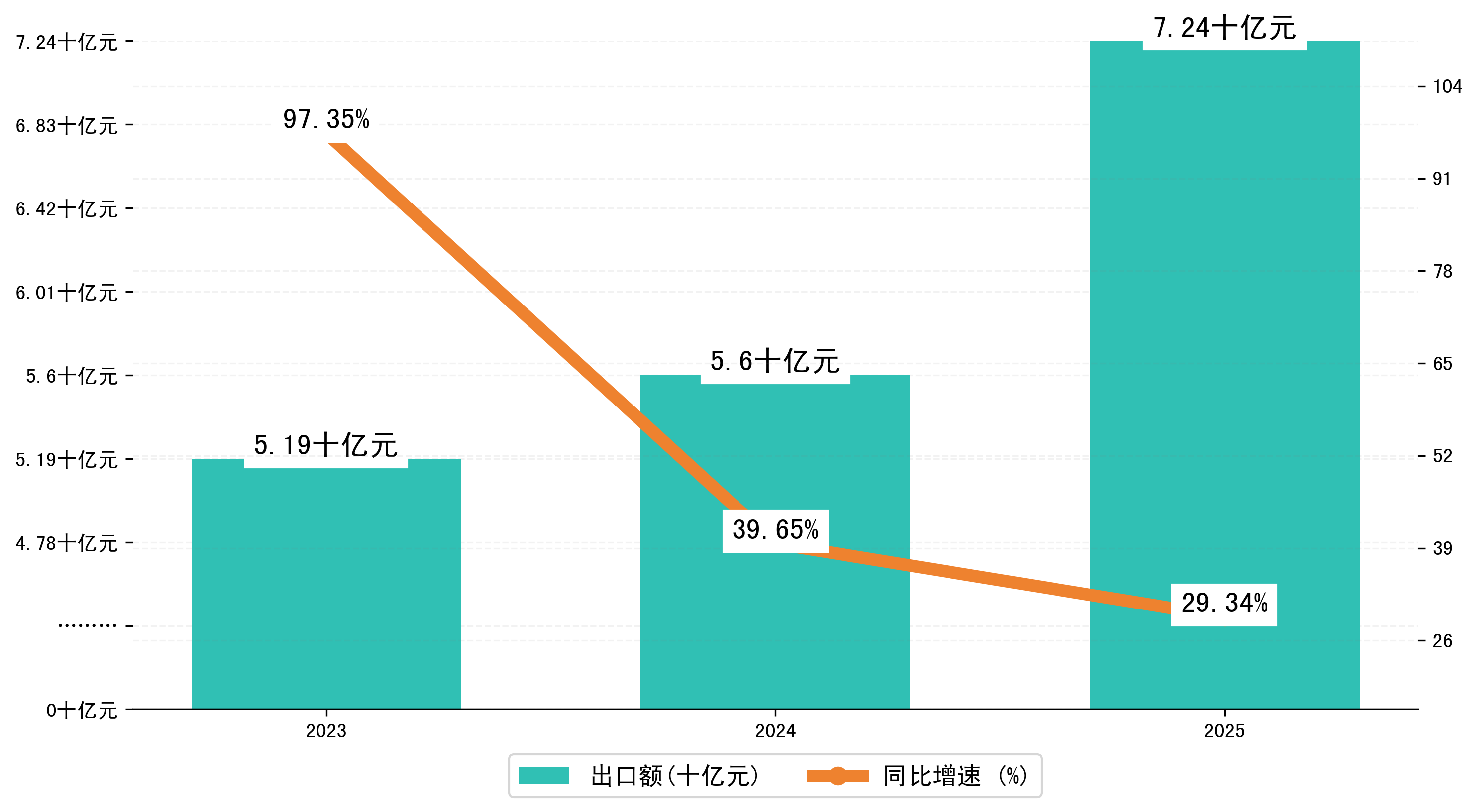 以人民币计,2025年1-3月宜宾市出口额为72,4305.9797万元,相比上年同期增加了16,4288.5973万元,同比增加了29.40%。