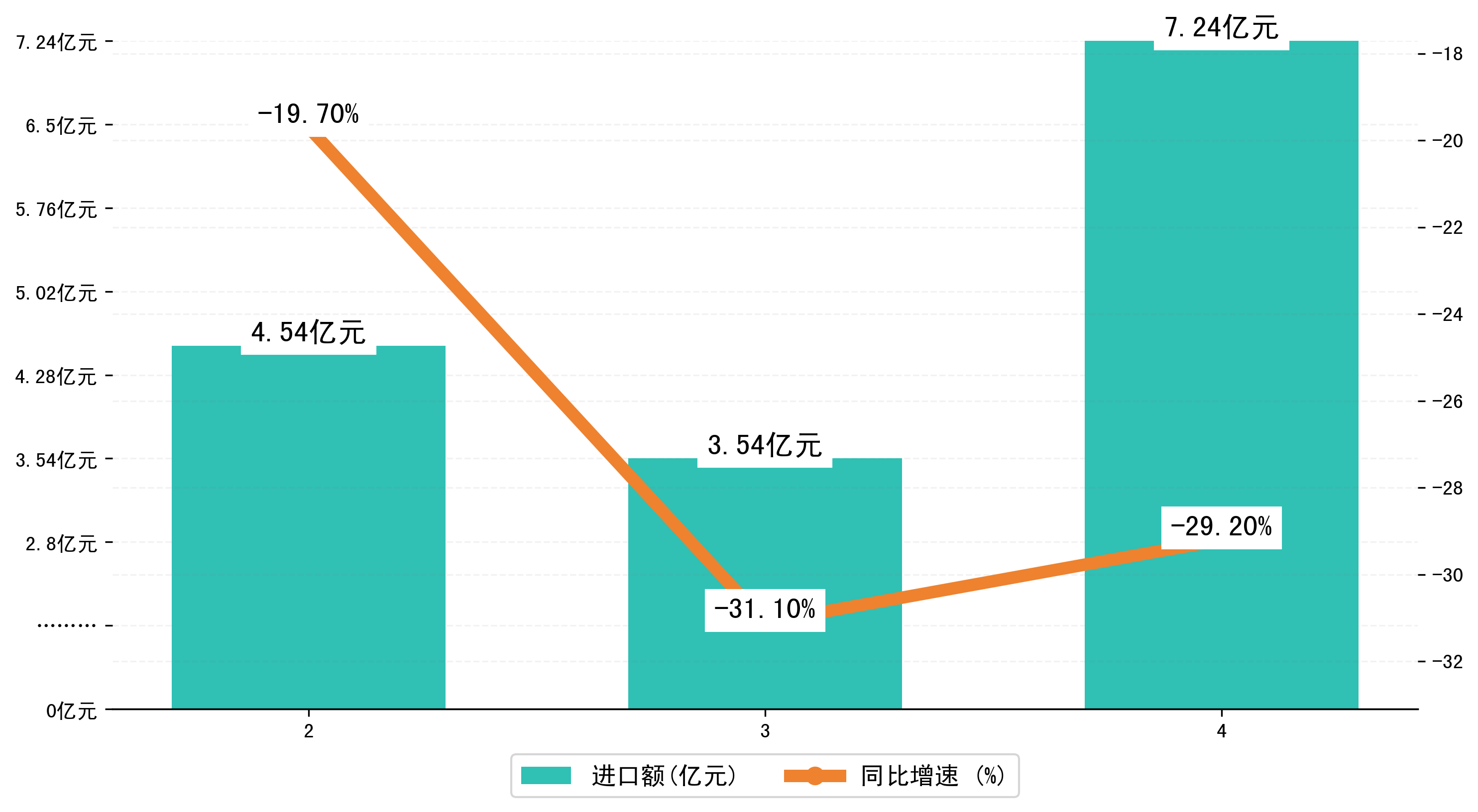 以人民币计,2025年4月宜宾市进口额为7,2408.2405万元,相比上月增加了3,7002.6191万元;相比上年同期减少了2,1633.5552万元,同比减少了-29.20%。