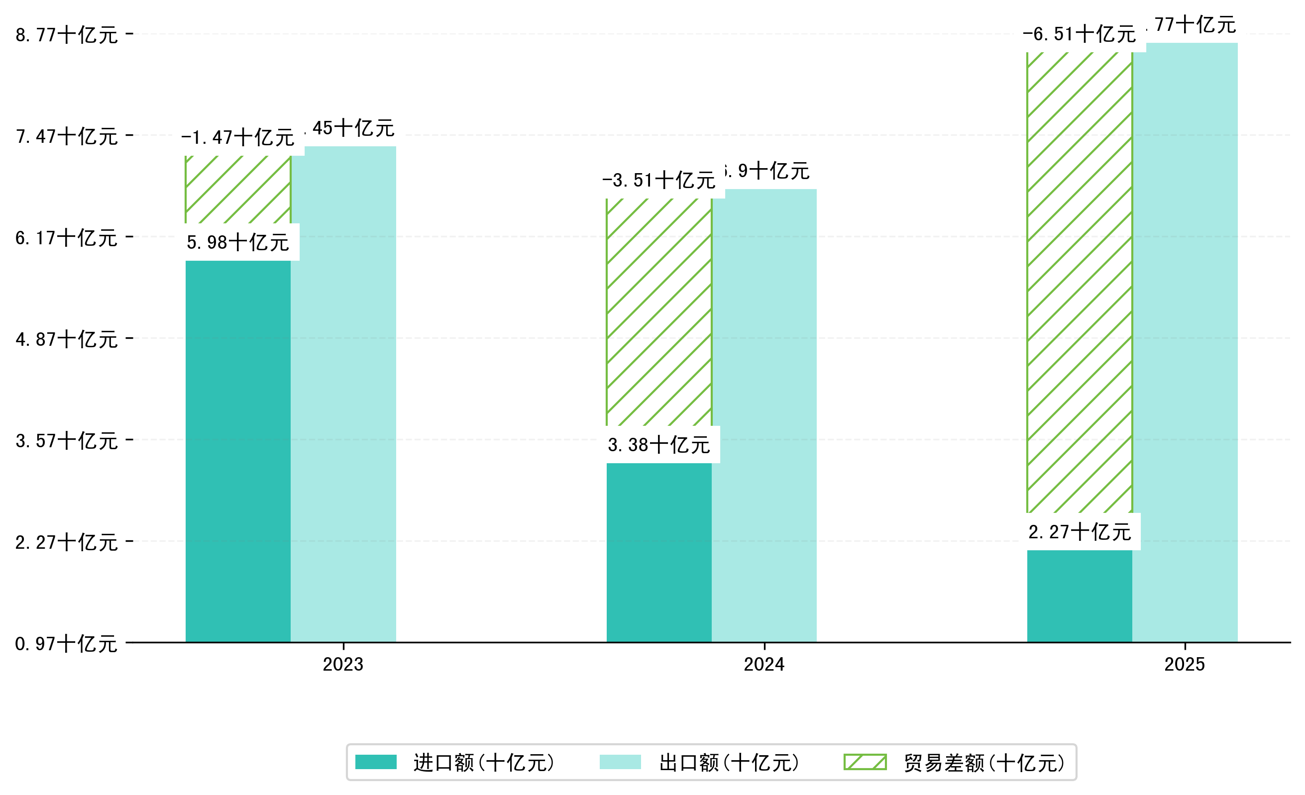 以美元计,2025年4月宜宾市贸易差额为1,1223,2303万美元(贸易顺差),相比上月减少了3,3999,2548万美元;相比上年同期增加了6199,4507万美元,同比增加123.4%。