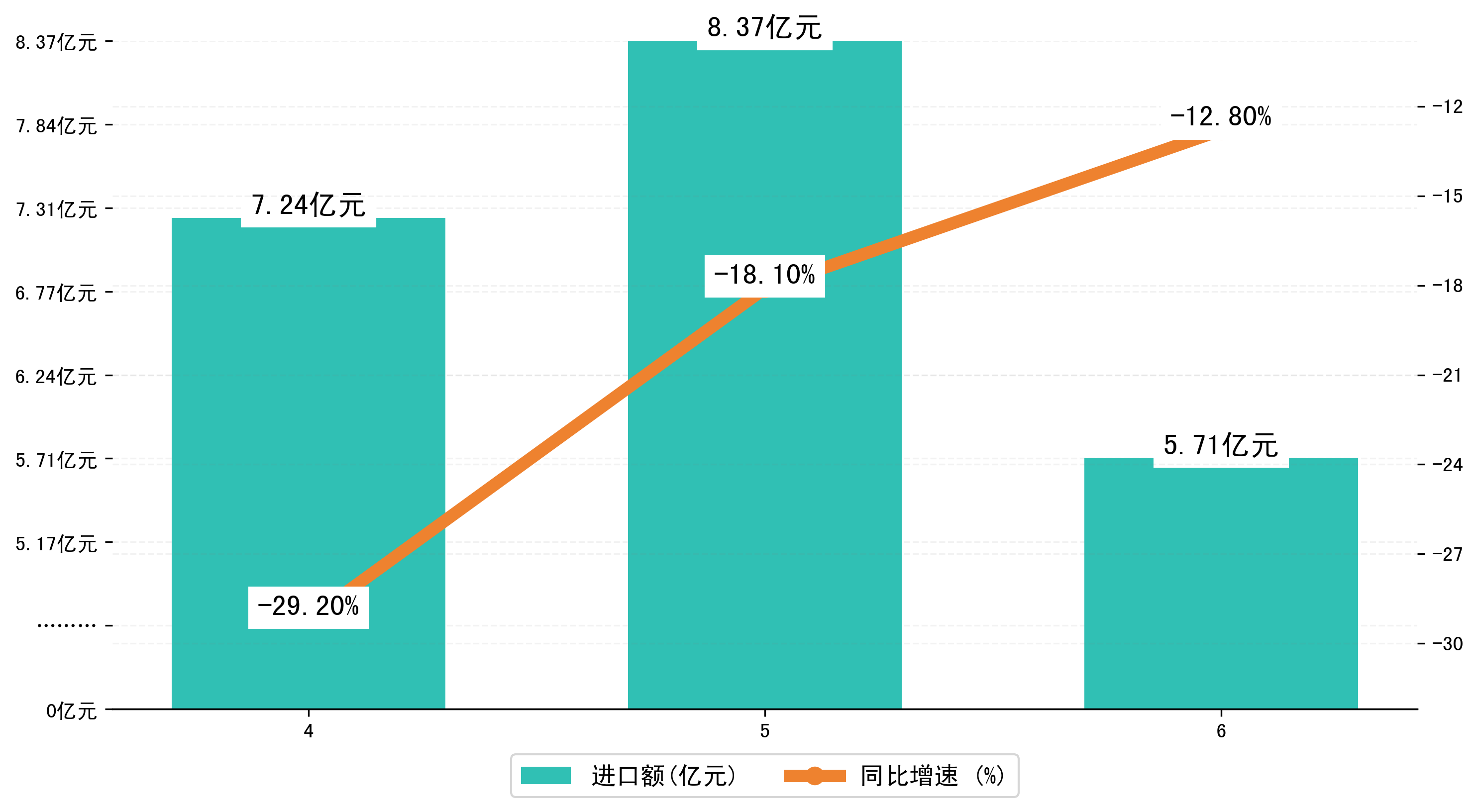 以美元计,2025年1-6月宜宾市进口额为5,1155.3424万美元,相比上年同期减少了1,1059.6592万美元,同比减少-13.80%。