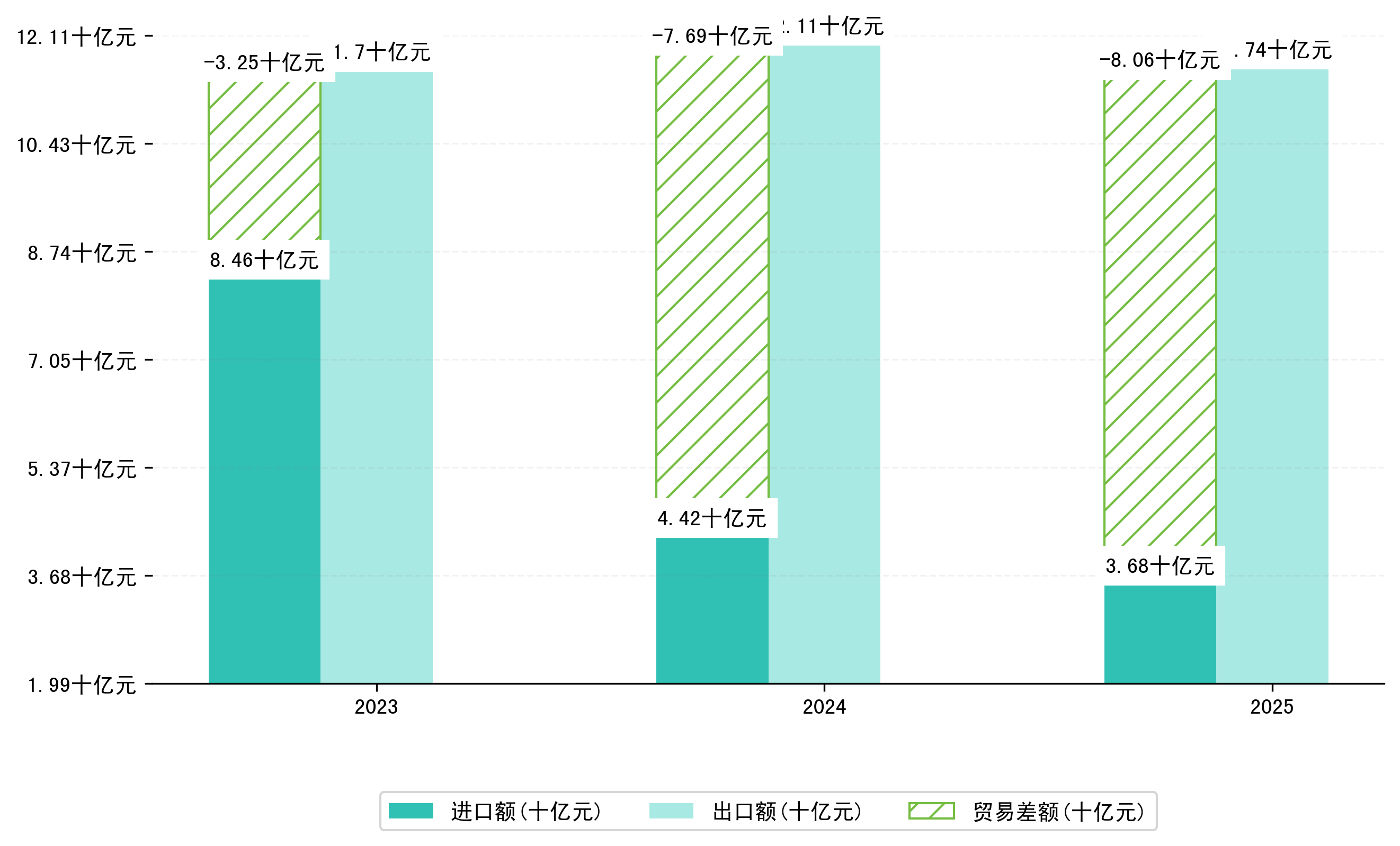以人民币计,2025年1-6月宜宾市贸易差额为80,6232,5638万元(贸易顺差),相比上年同期增加了3,6845,0525万元,同比增加4.79%。