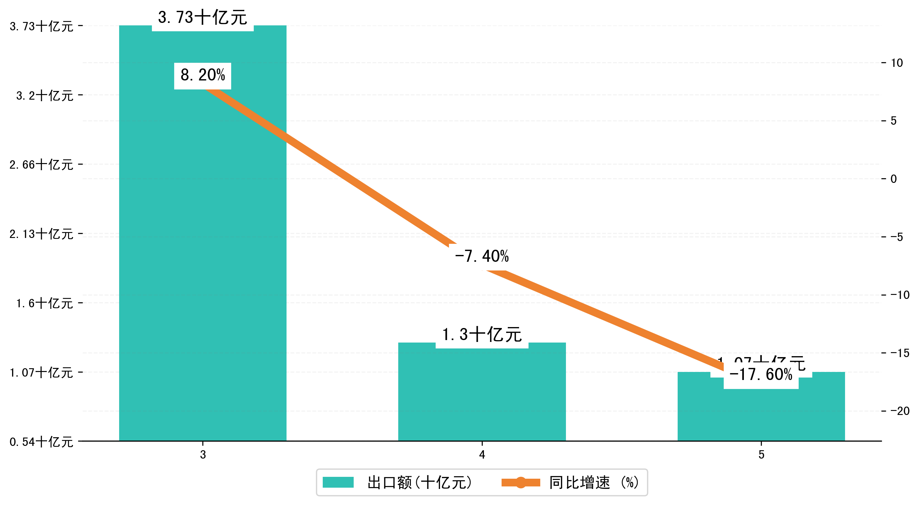 以人民币计,2024年5月宜宾市出口额为10,7303.1387万元,相比上月减少了2,2405.3791万元;相比上年同期减少了11,5557.721万元,同比减少了-17.60%。