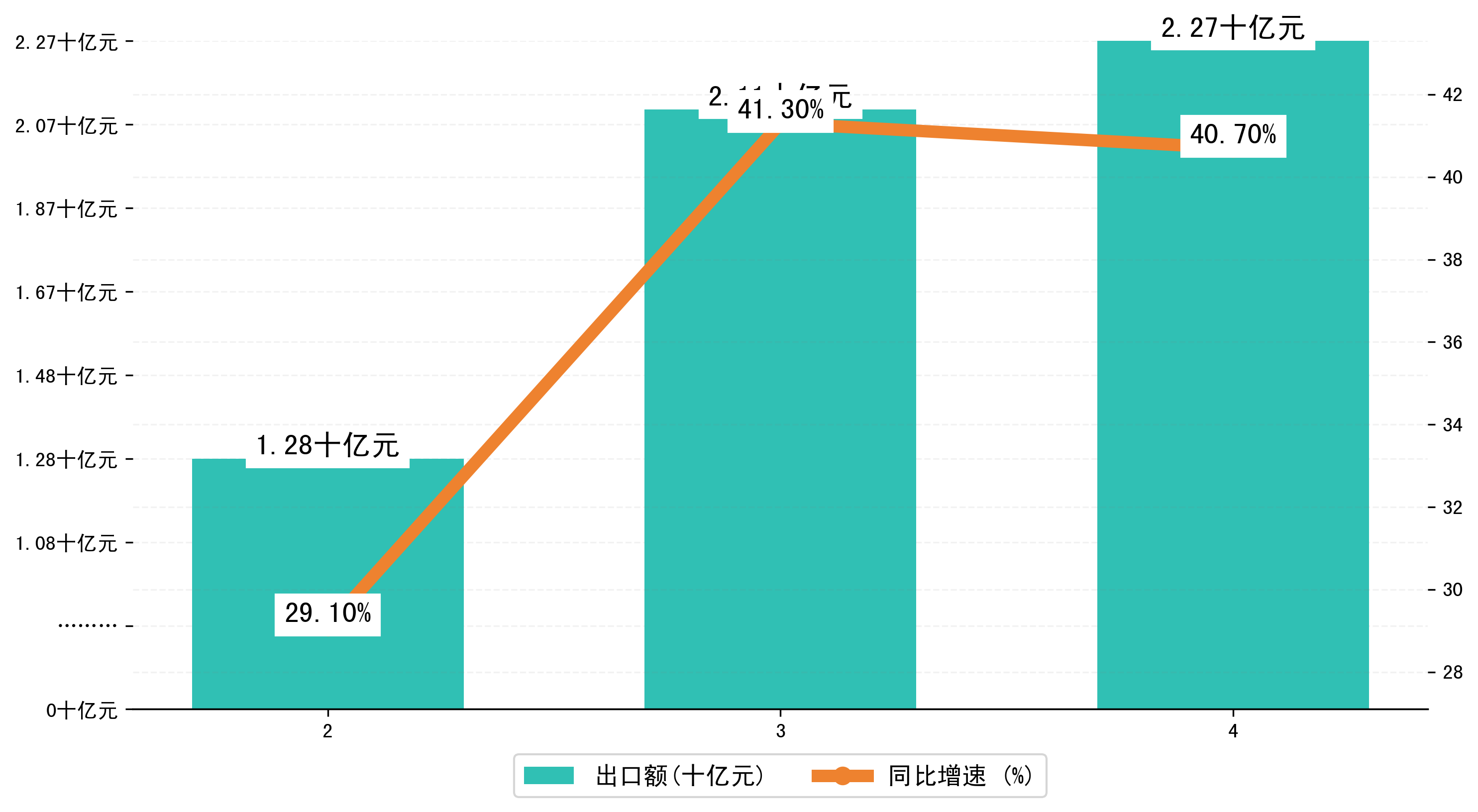 以美元计,2023年1-4月宜宾市出口额为10,8413.7501万美元,相比上年同期增加了2,5310.8436万美元,同比增加30.50%。