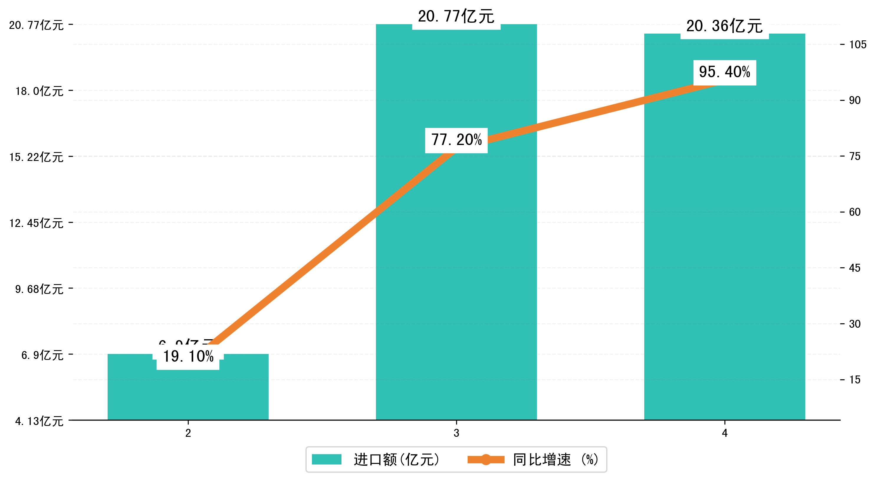 以人民币计,2023年4月宜宾市进口额为20,3632.901万元,相比上月减少了4055.8419万元;相比上年同期增加了12,1866.9115万元,同比增加了95.40%。