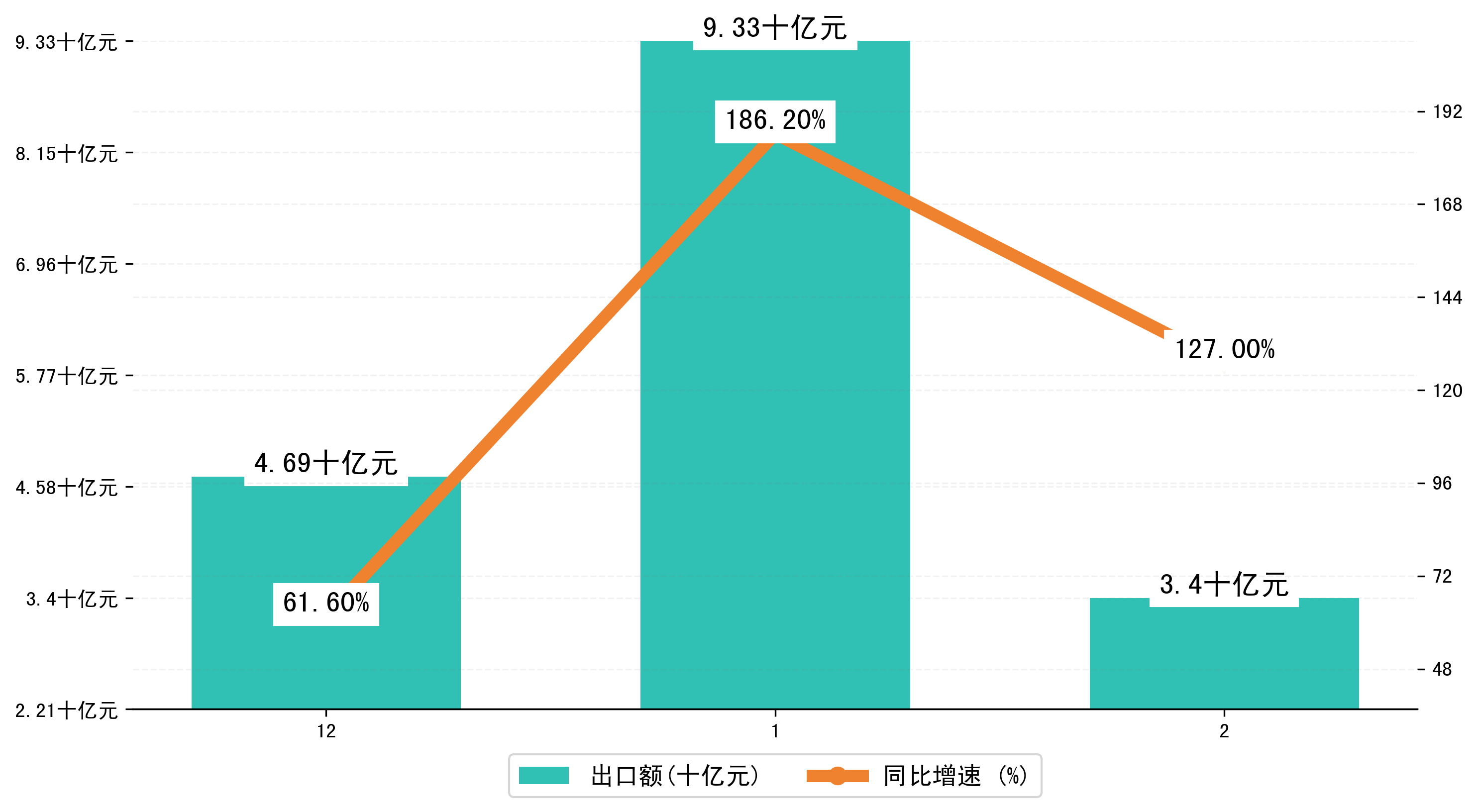 以人民币计,2023年1-2月宜春市出口额为127,3126.8126万元,相比上年同期增加了71,2153.8122万元,同比增加了127.00%。