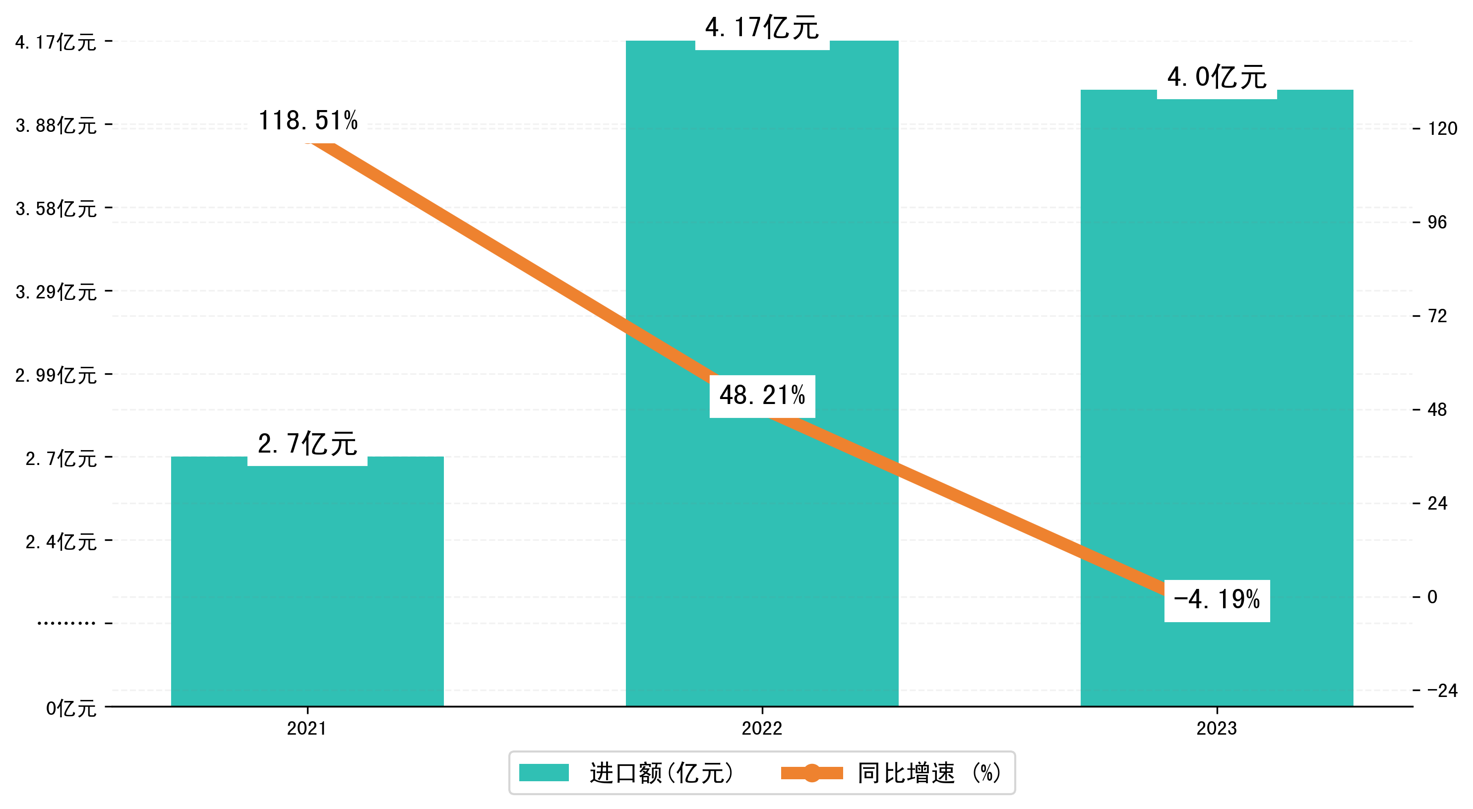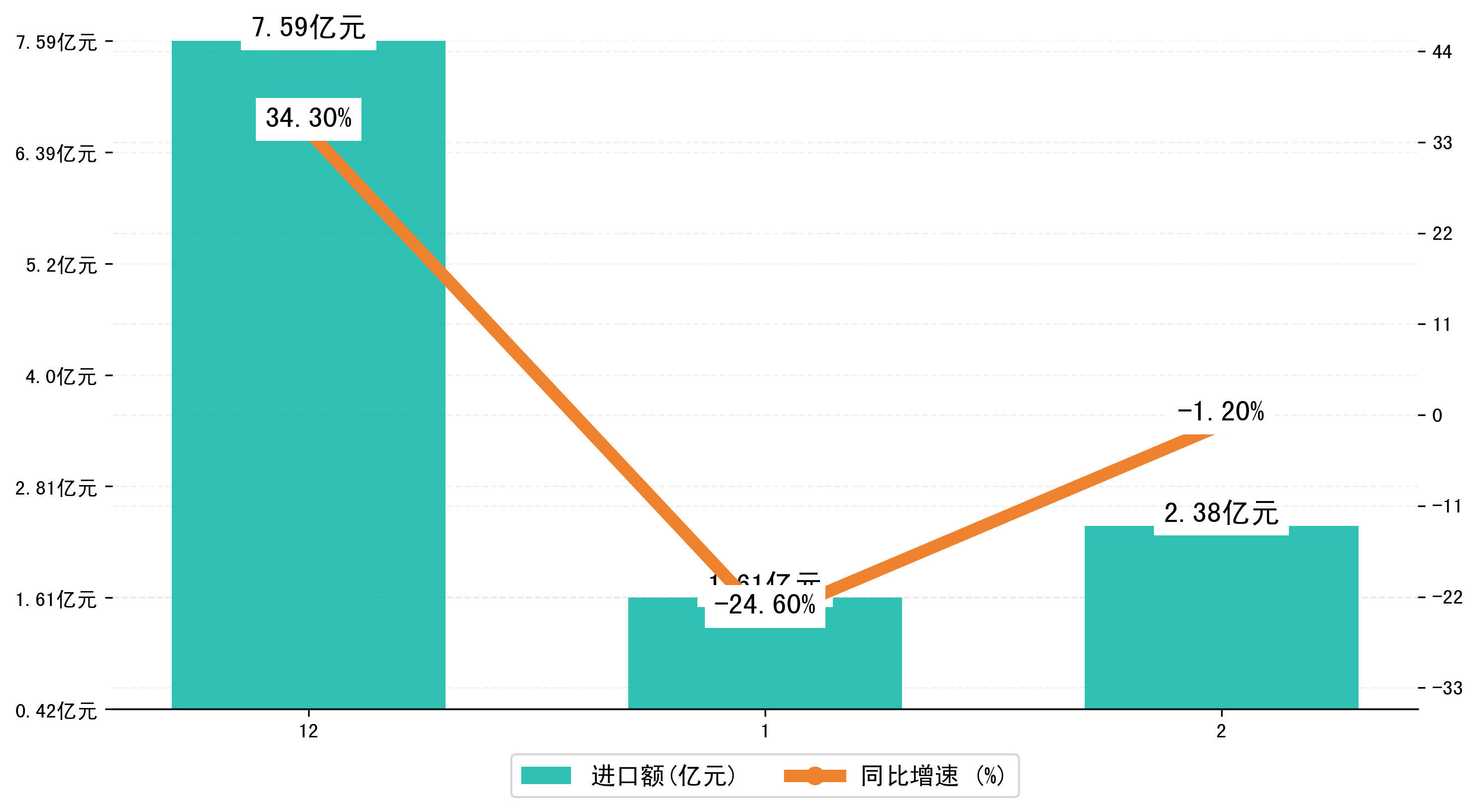 以美元计,2023年2月宜春市进口额为3518.1206万美元,相比上月增加了1205.6024万美元;相比上年同期增加了524.622万美元,同比减少-8.10%。