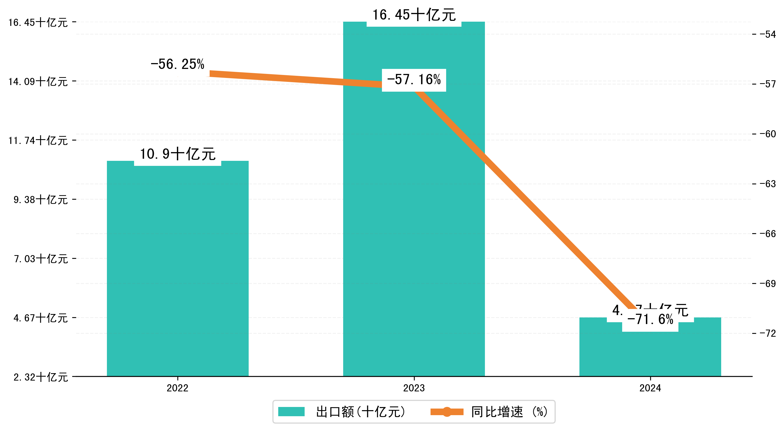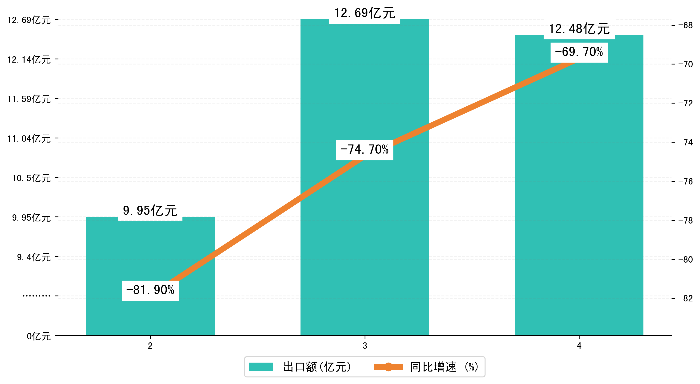 以美元计,2024年1-4月宜春市出口额为6,5756.87万美元,相比上年同期减少了17,2455.6107万美元,同比减少-70.60%。
