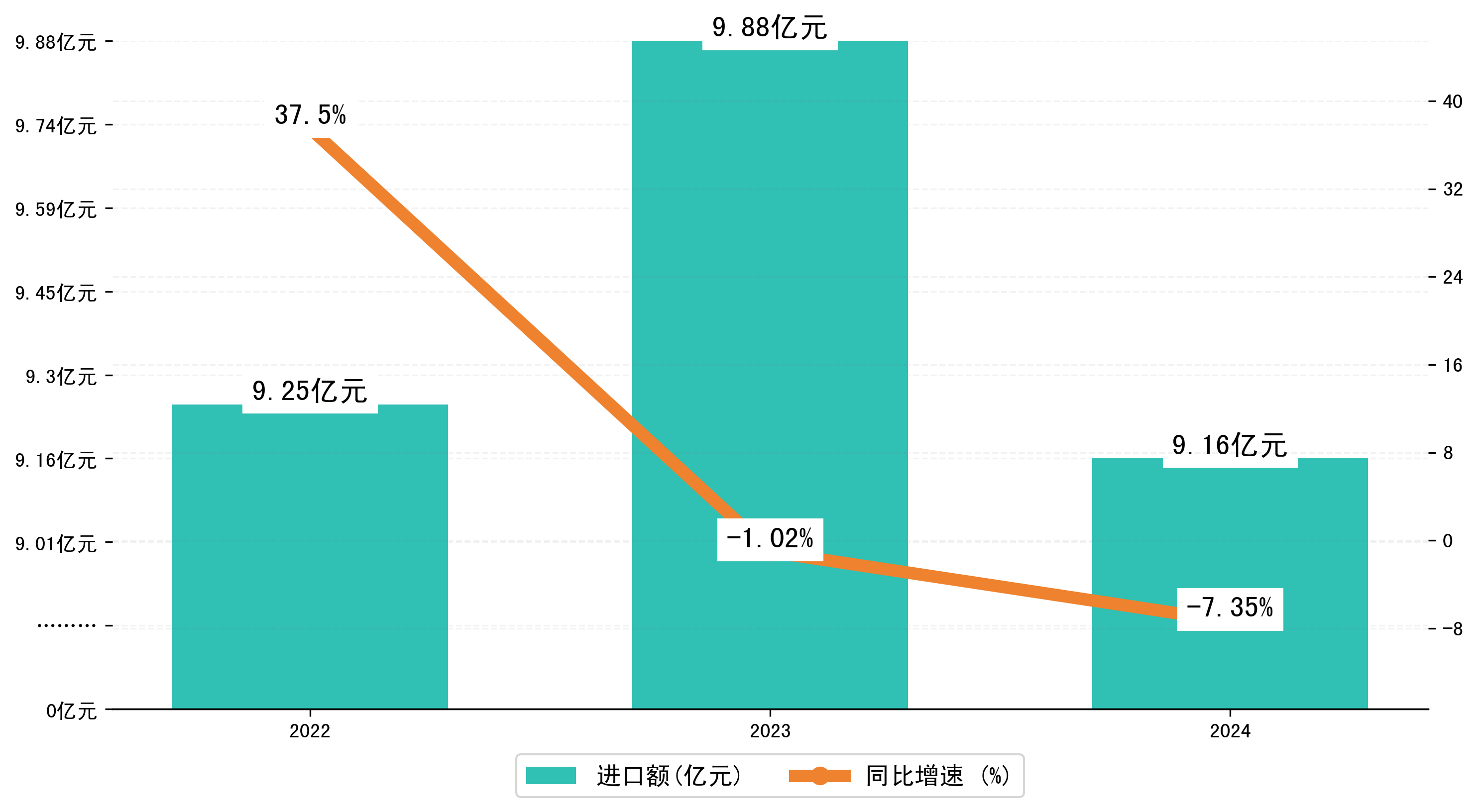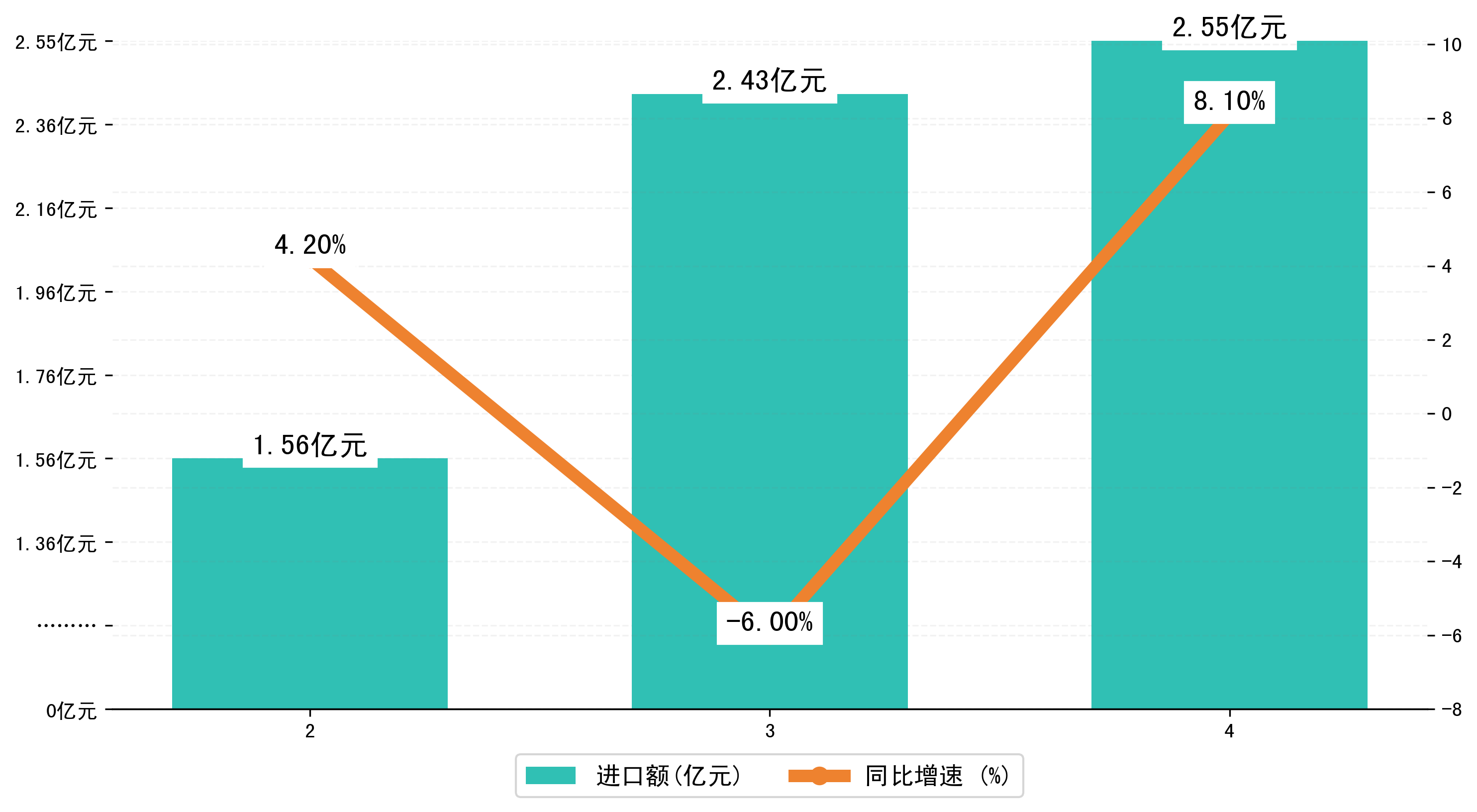 以人民币计,2024年1-4月宜春市进口额为9,1573.1675万元,相比上年同期减少了7265.8586万元,同比增加了8.10%。