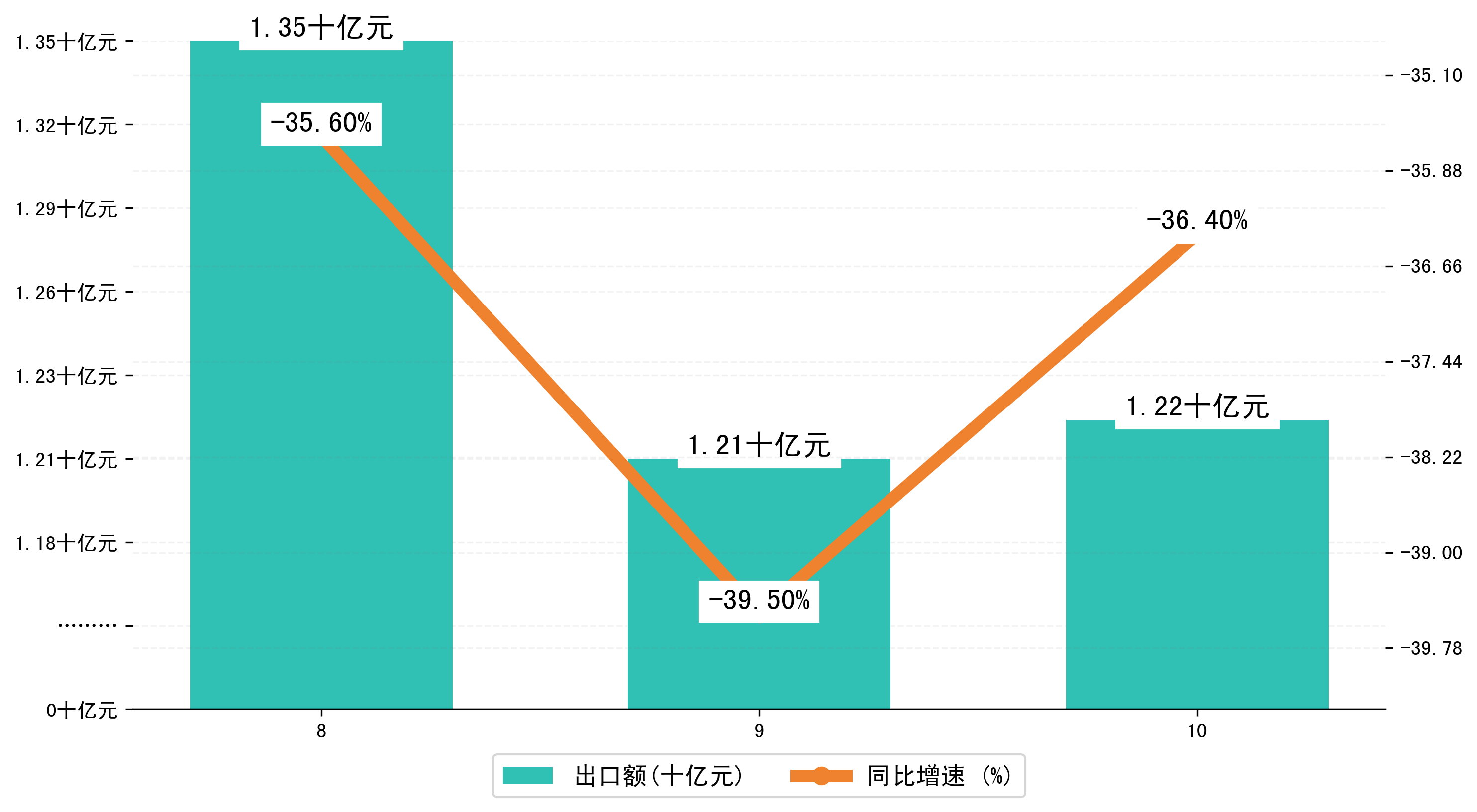 以人民币计,2023年10月宜春市出口额为12,1969.3441万元,相比上月增加了1306.274万元;相比上年同期减少了8,3272.9469万元,同比减少了-36.40%。