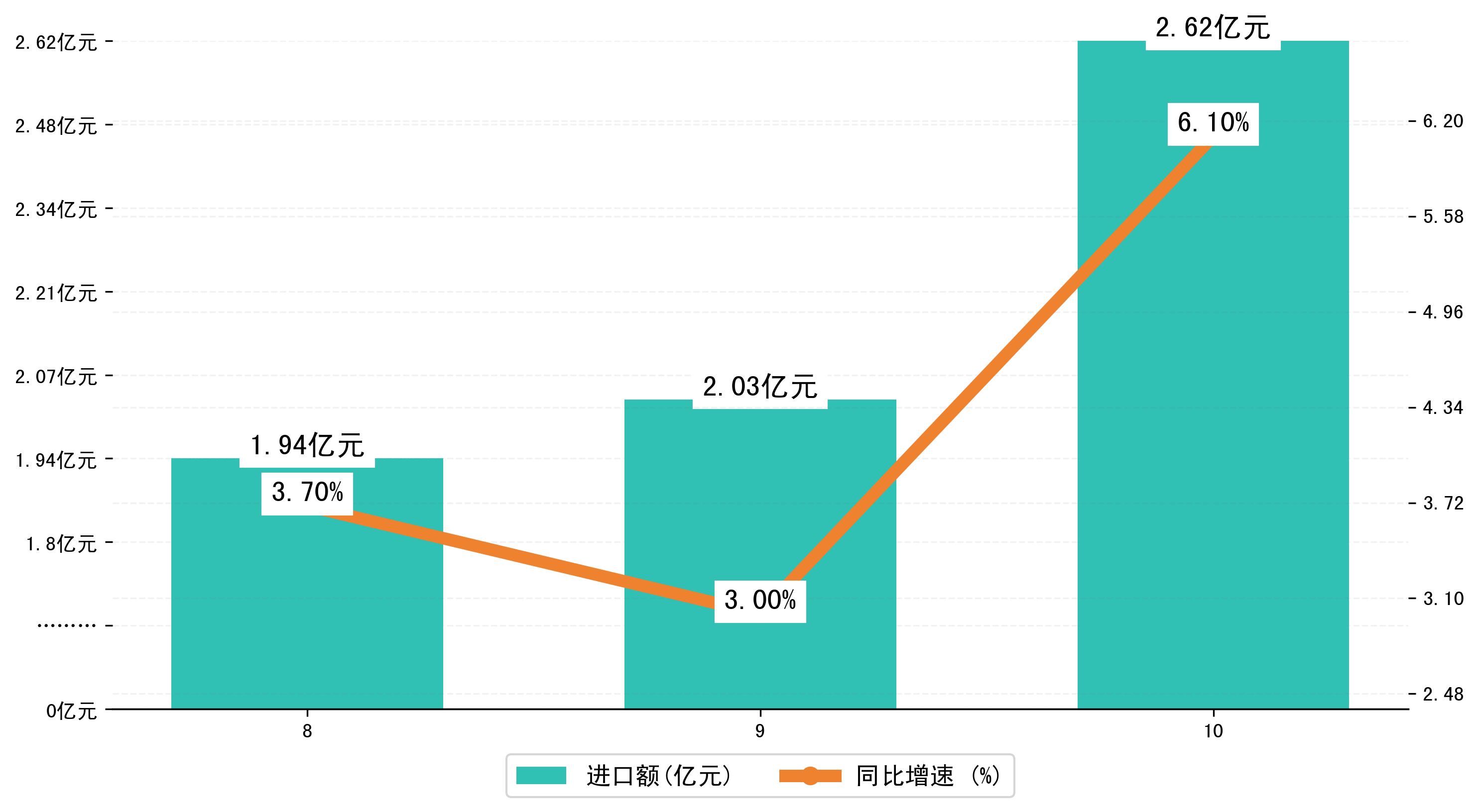 以人民币计,2023年1-10月宜春市进口额为21,2037.9188万元,相比上年同期减少了1,3109.4506万元,同比增加了6.10%。