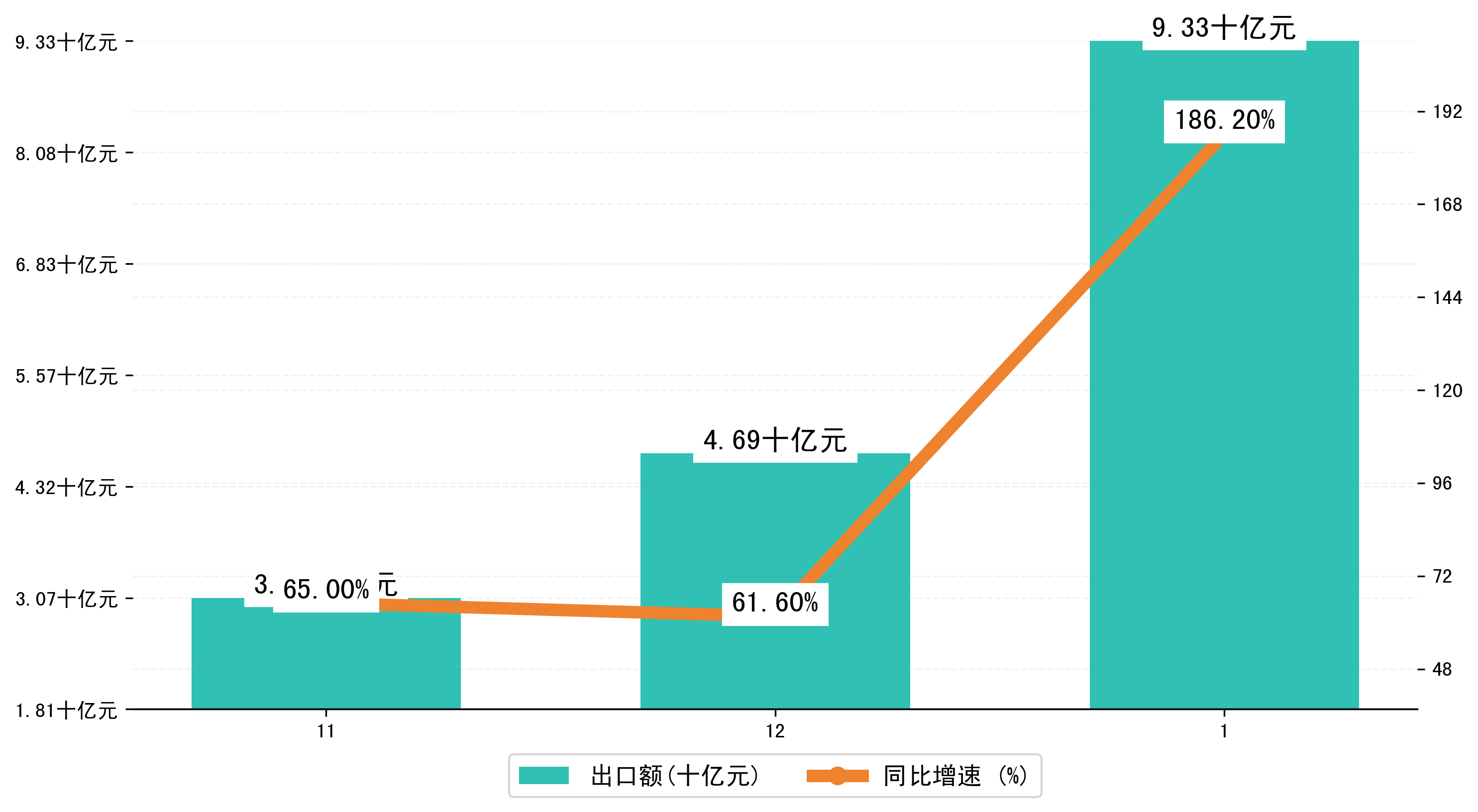 以人民币计,2023年1-1月宜春市出口额为93,3382.1303万元,相比上年同期增加了60,7177.3623万元,同比增加了186.20%。