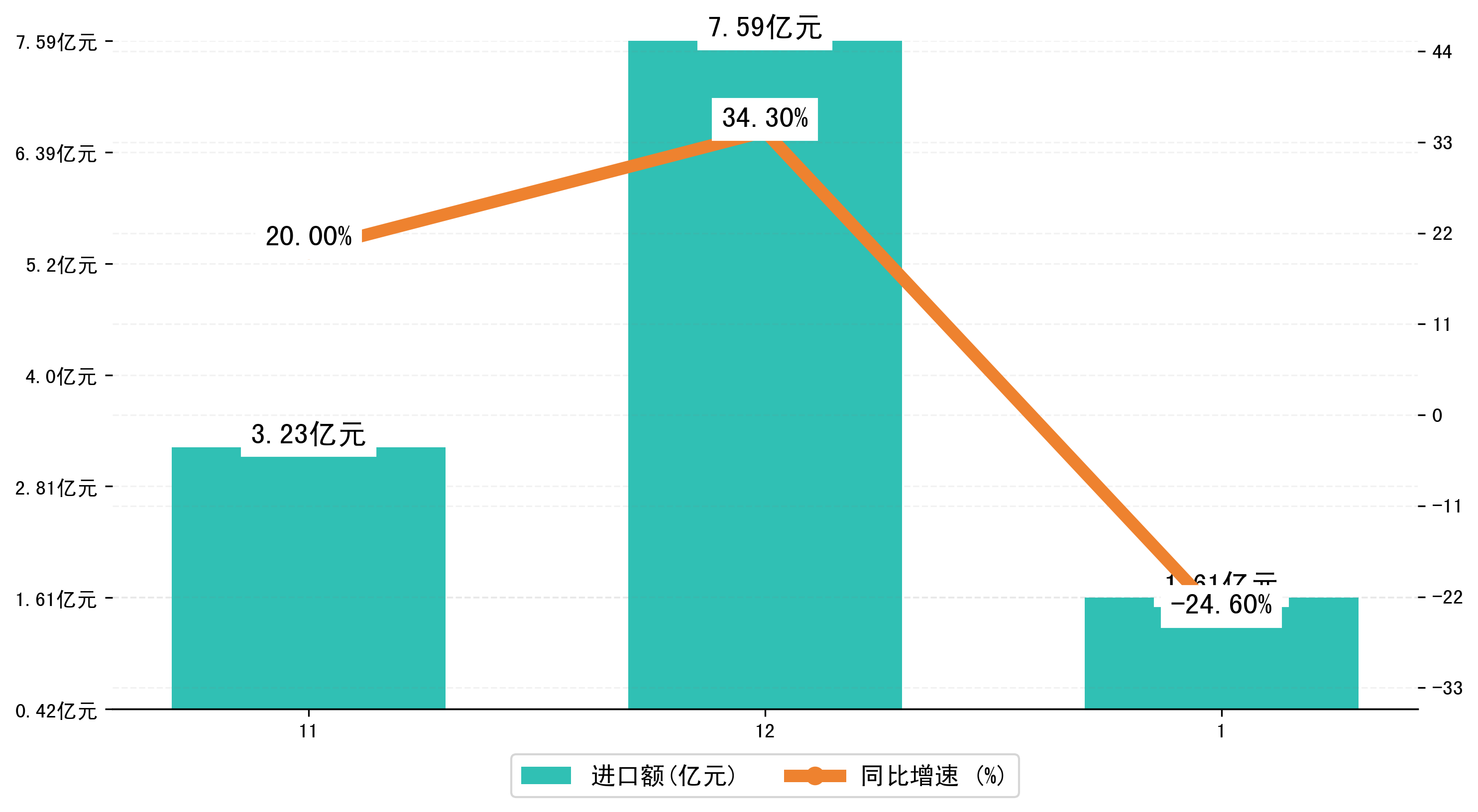 以人民币计,2023年1-1月宜春市进口额为1,6122.1451万元,相比上年同期减少了6512.3137万元,同比减少了-24.60%。