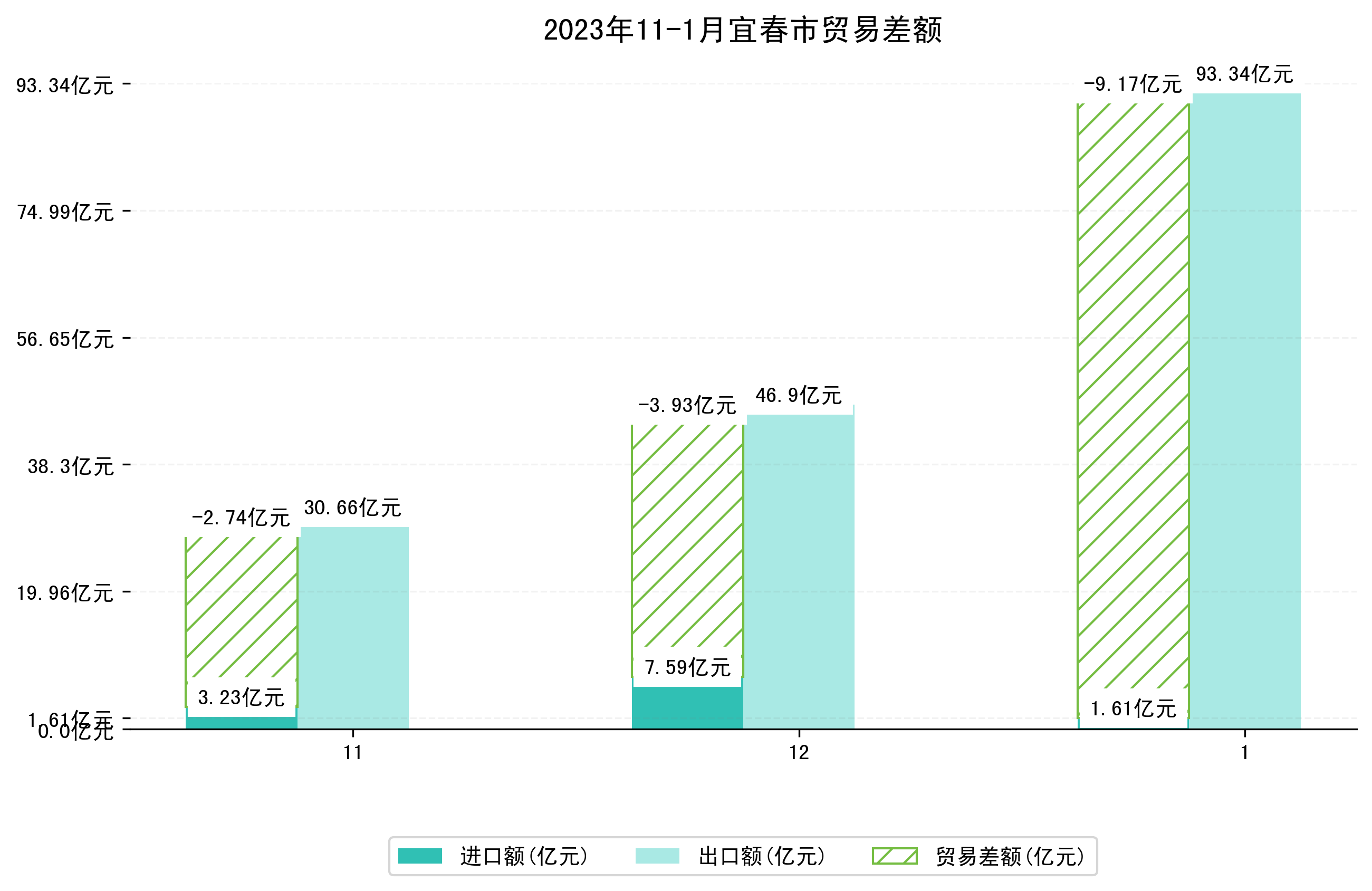 以人民币计,2023年1-1月宜春市贸易差额为91,7259,9852万元(贸易顺差),相比上年同期增加了61,3689,6760万元,同比增加202.16%。