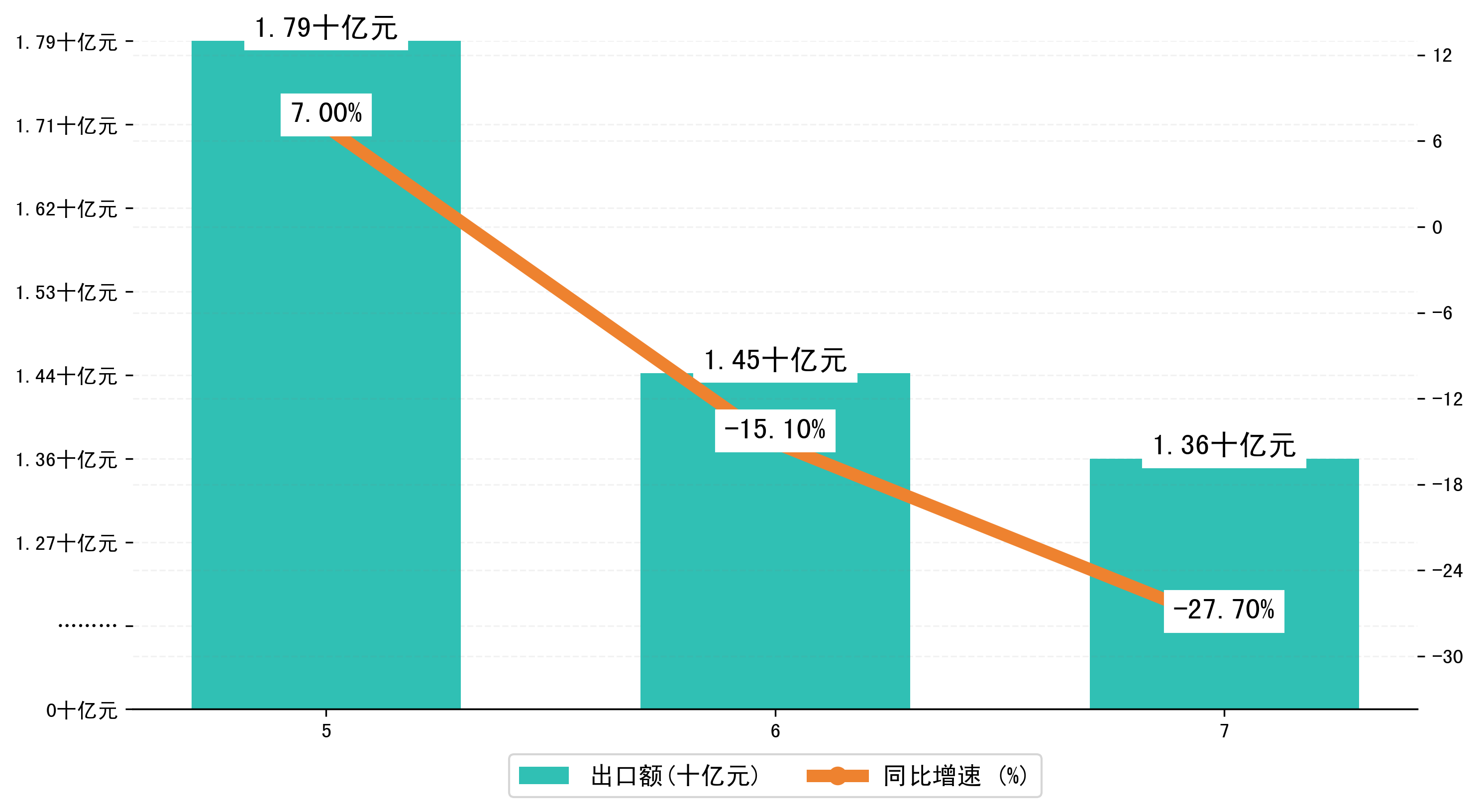 以人民币计,2023年7月宜春市出口额为13,5559.819万元,相比上月减少了8947.0737万元;相比上年同期减少了46,8749.8156万元,同比减少了-27.70%。