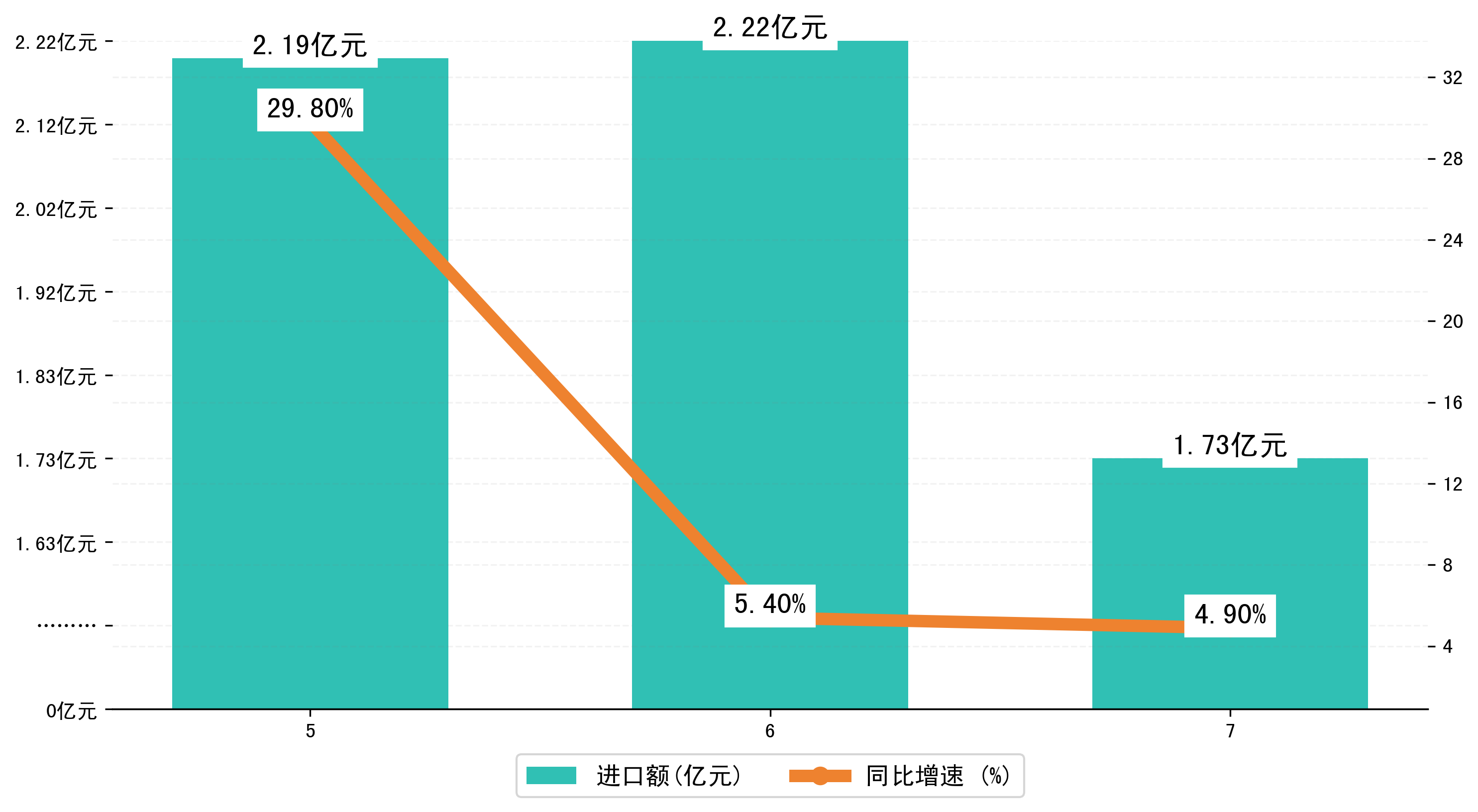 以美元计,2023年1-7月宜春市进口额为2,1160.9308万美元,相比上年同期减少了4622.5108万美元,同比增加-1.40%。