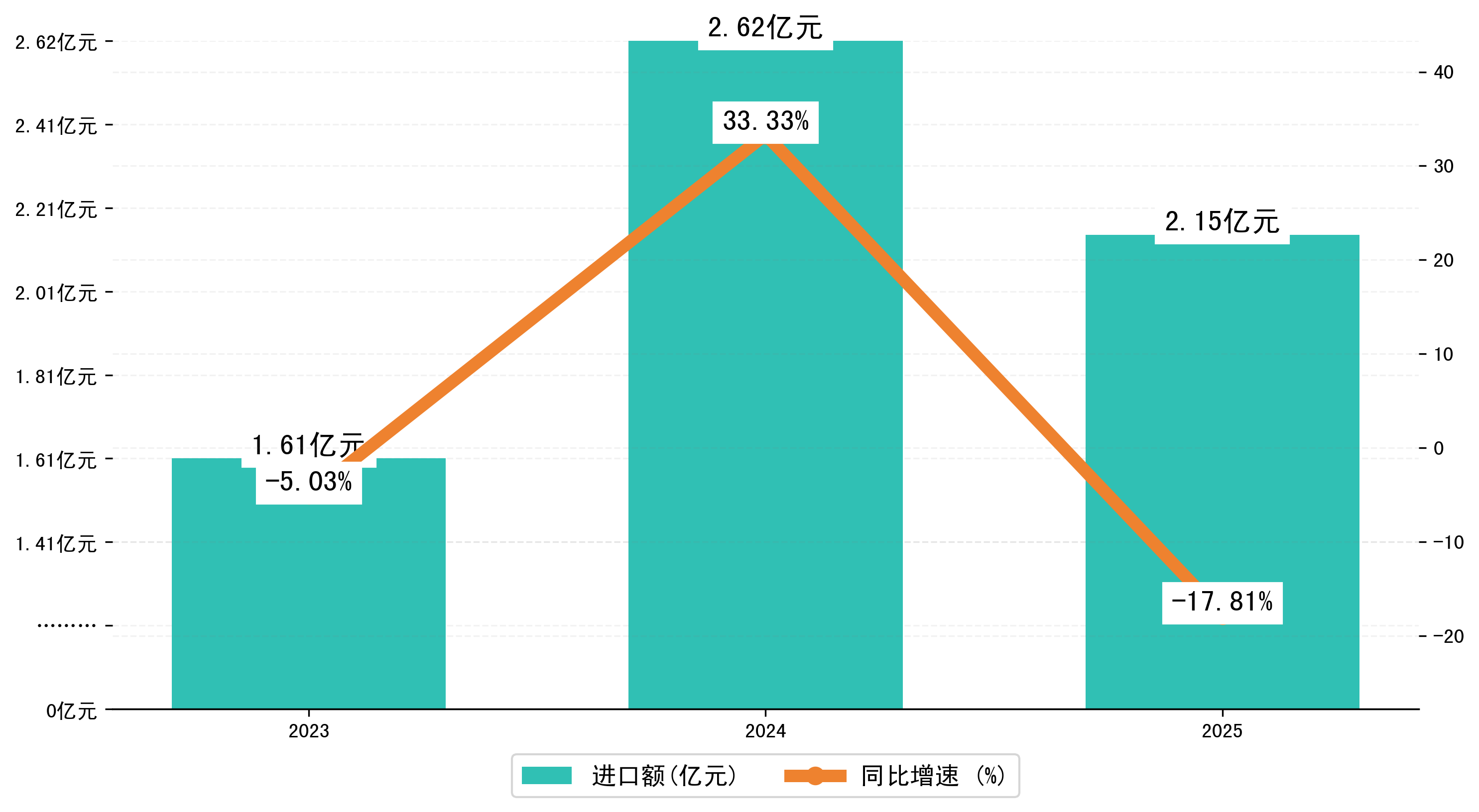 以人民币计,2025年1-1月宜春市进口额为2,1495.9307万元,相比上年同期减少了4658.3286万元,同比减少了-17.80%。