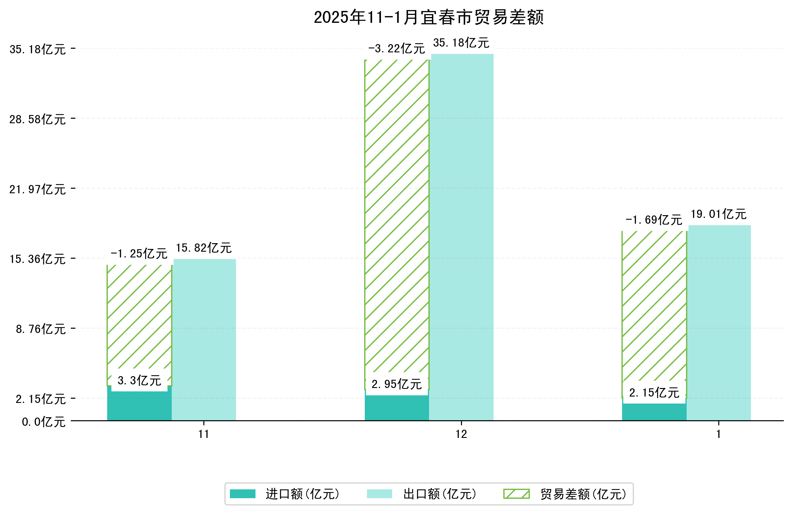 以美元计,2025年1-1月宜春市贸易差额为2,3452,8894万美元(贸易顺差),相比上年同期增加了1,0813,1903万美元,同比增加85.55%。