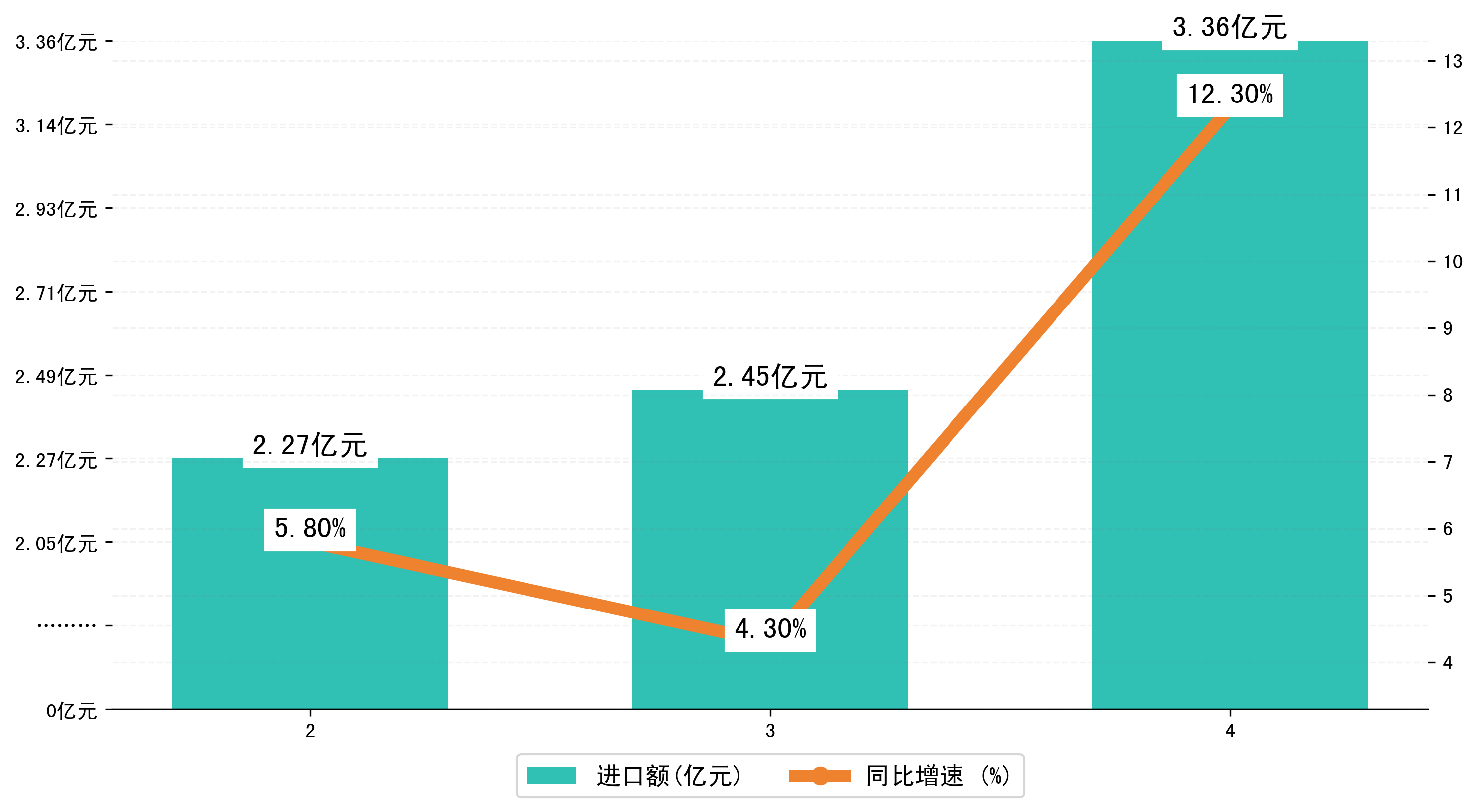 以人民币计,2025年4月宜春市进口额为3,3616.6551万元,相比上月增加了9110.1622万元;相比上年同期增加了8076.0118万元,同比增加了12.30%。