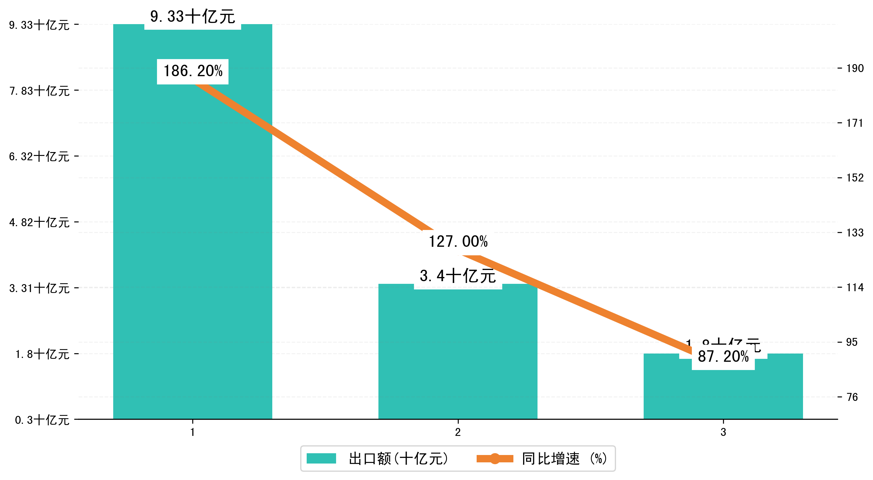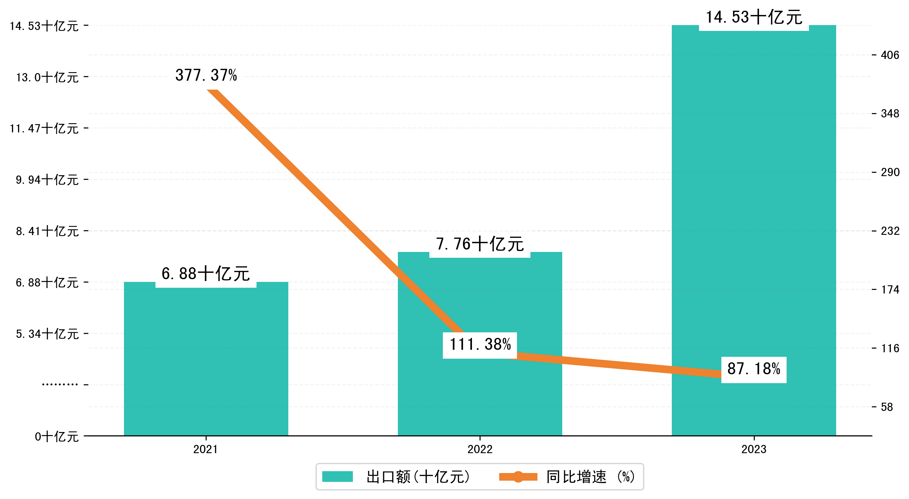 以人民币计,2023年1-3月宜春市出口额为145,3427.9199万元,相比上年同期增加了67,6932.2483万元,同比增加了87.20%。