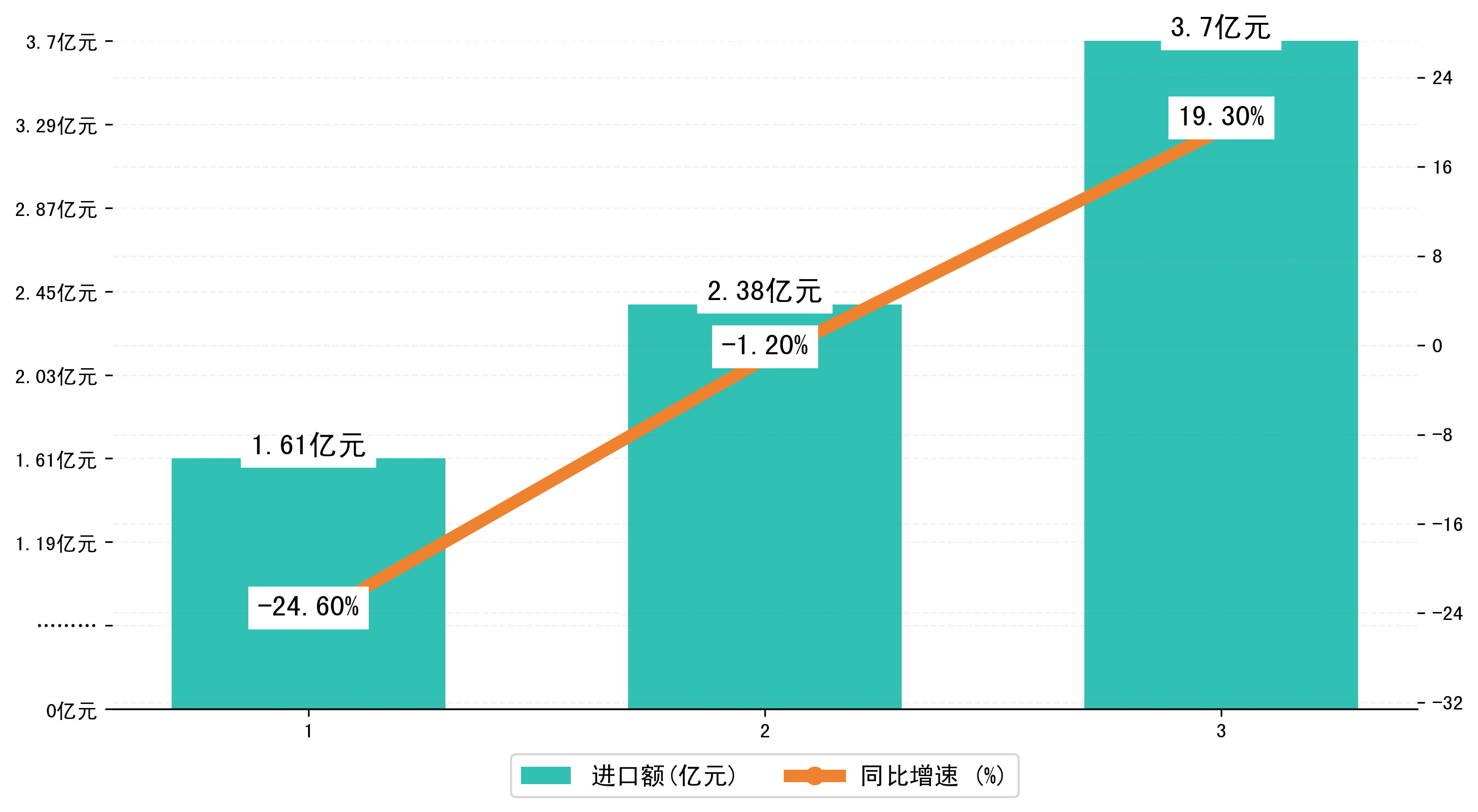 以人民币计,2023年3月宜春市进口额为3,7046.8745万元,相比上月增加了1,3203.0438万元;相比上年同期增加了82.3438万元,同比增加了19.30%。