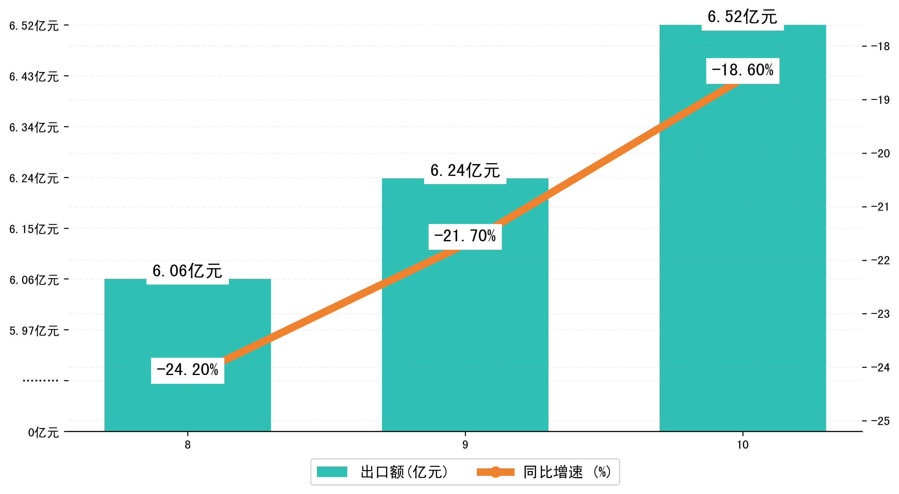 以人民币计,2024年1-10月银川市出口额为62,4790.964万元,相比上年同期减少了12,7010.6667万元,同比减少了-18.60%。