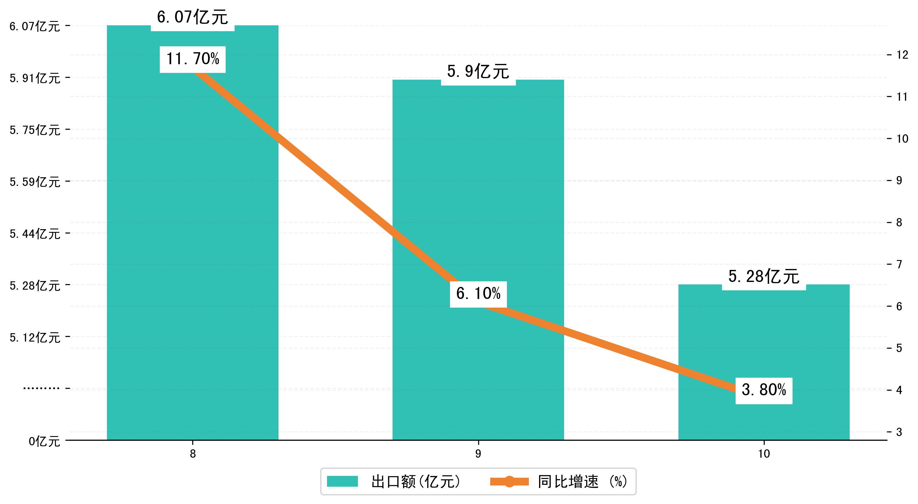 以人民币计,2023年10月银川市出口额为5,2810.8589万元,相比上月减少了6196.4508万元;相比上年同期减少了2,6008.2334万元,同比增加了3.80%。