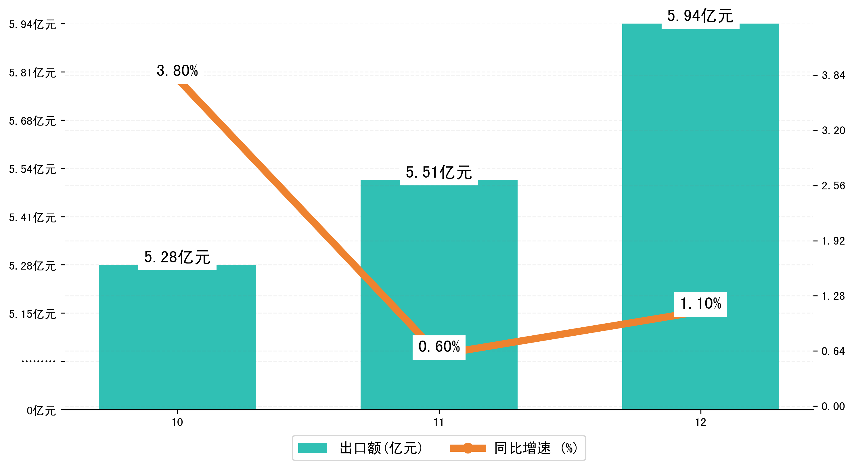以人民币计,2023年1-12月银川市出口额为88,2329.9612万元,相比上年同期减少了34,3803.548万元,同比增加了1.10%。