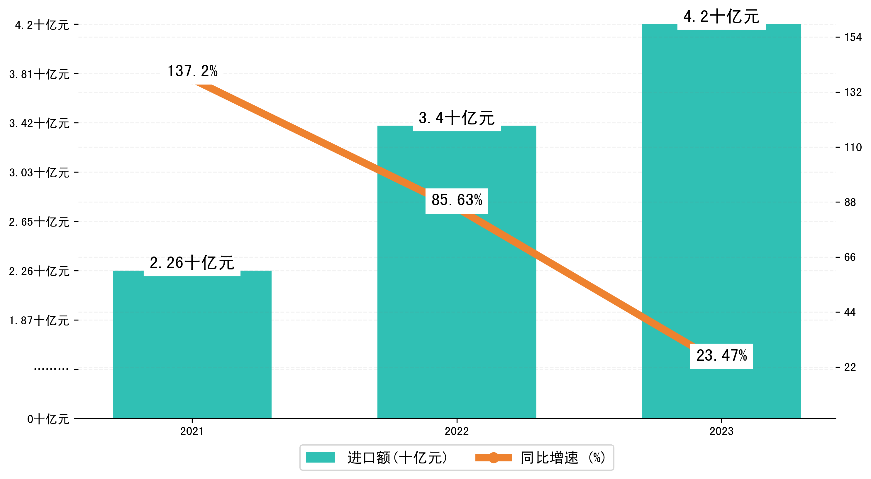 以美元计,2023年1-12月银川市进口额为5,9557.0493万美元,相比上年同期增加了9160.6543万美元,同比增加47.60%。