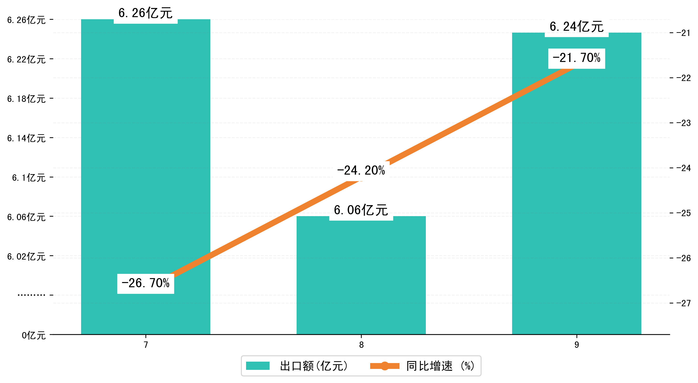 以人民币计,2024年1-9月银川市出口额为55,9577.983万元,相比上年同期减少了13,9412.7888万元,同比减少了-21.70%。