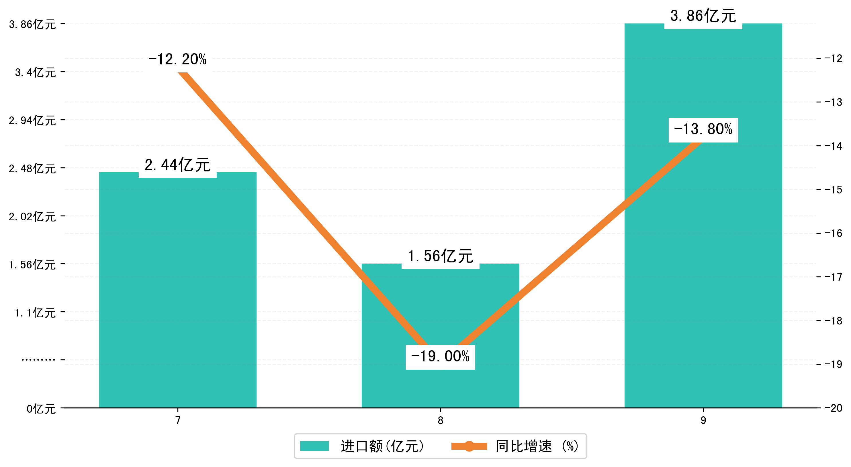 以人民币计,2024年1-9月银川市进口额为28,6305.841万元,相比上年同期减少了1,3786.0885万元,同比减少了-13.80%。