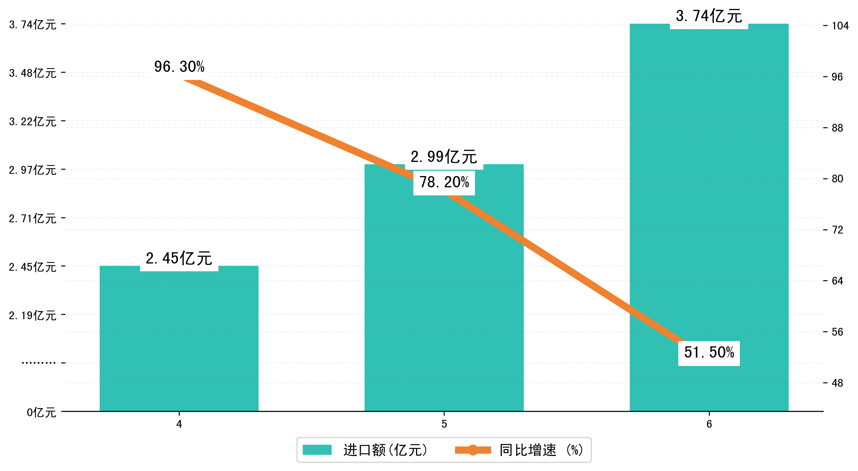 以人民币计,2023年6月银川市进口额为3,7423.7375万元,相比上月增加了7520.8298万元;相比上年同期增加了1,0535.4923万元,同比增加了51.50%。