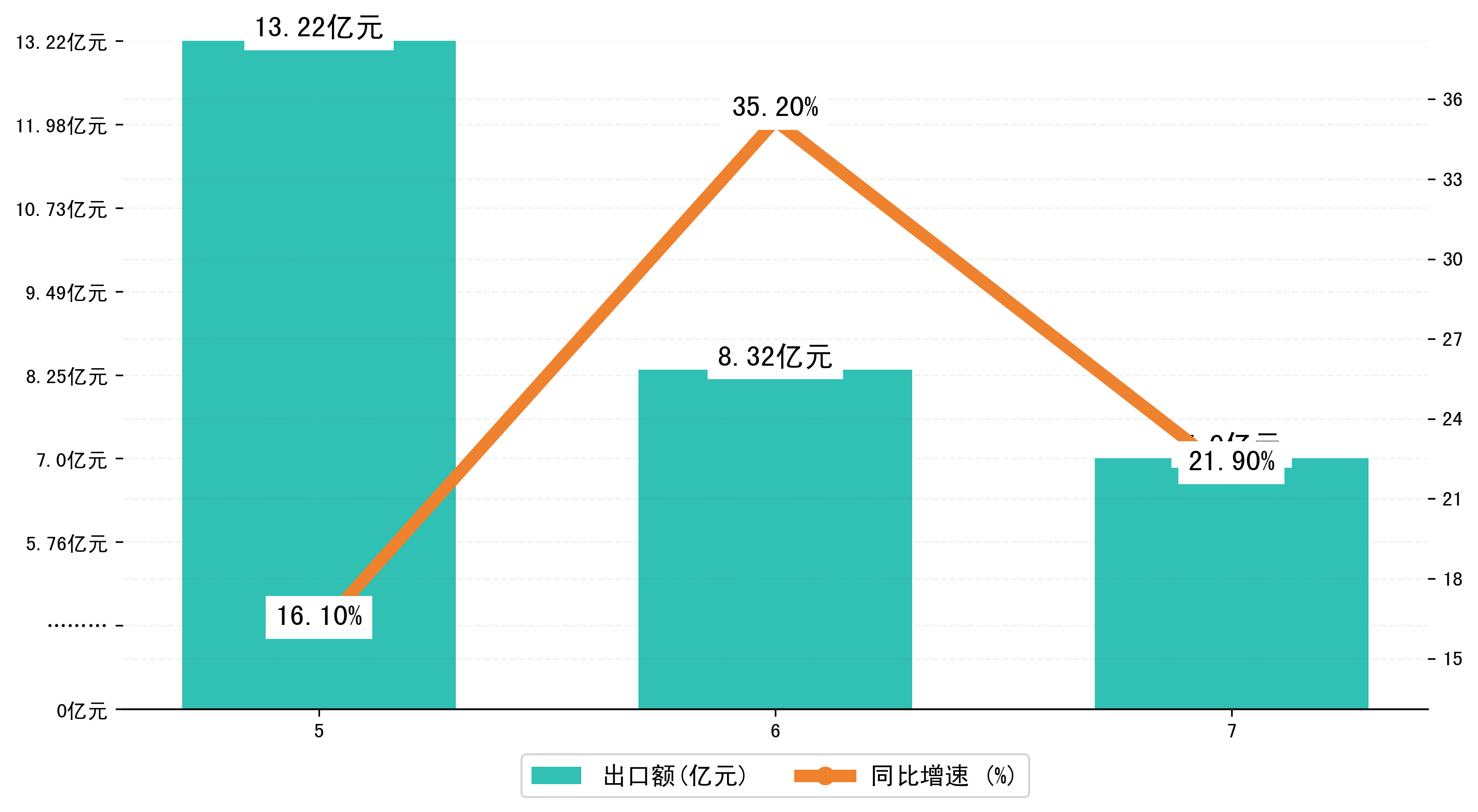 以人民币计,2023年7月银川市出口额为7,0034.7581万元,相比上月减少了1,3191.4466万元;相比上年同期减少了7,5203.6768万元,同比增加了21.90%。