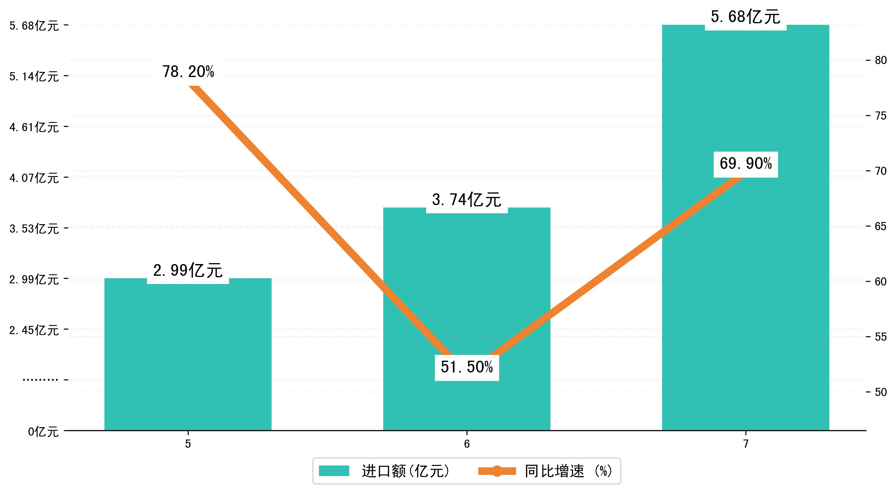 以人民币计,2023年7月银川市进口额为5,6835.591万元,相比上月增加了1,9411.8535万元;相比上年同期增加了3,2307.8158万元,同比增加了69.90%。