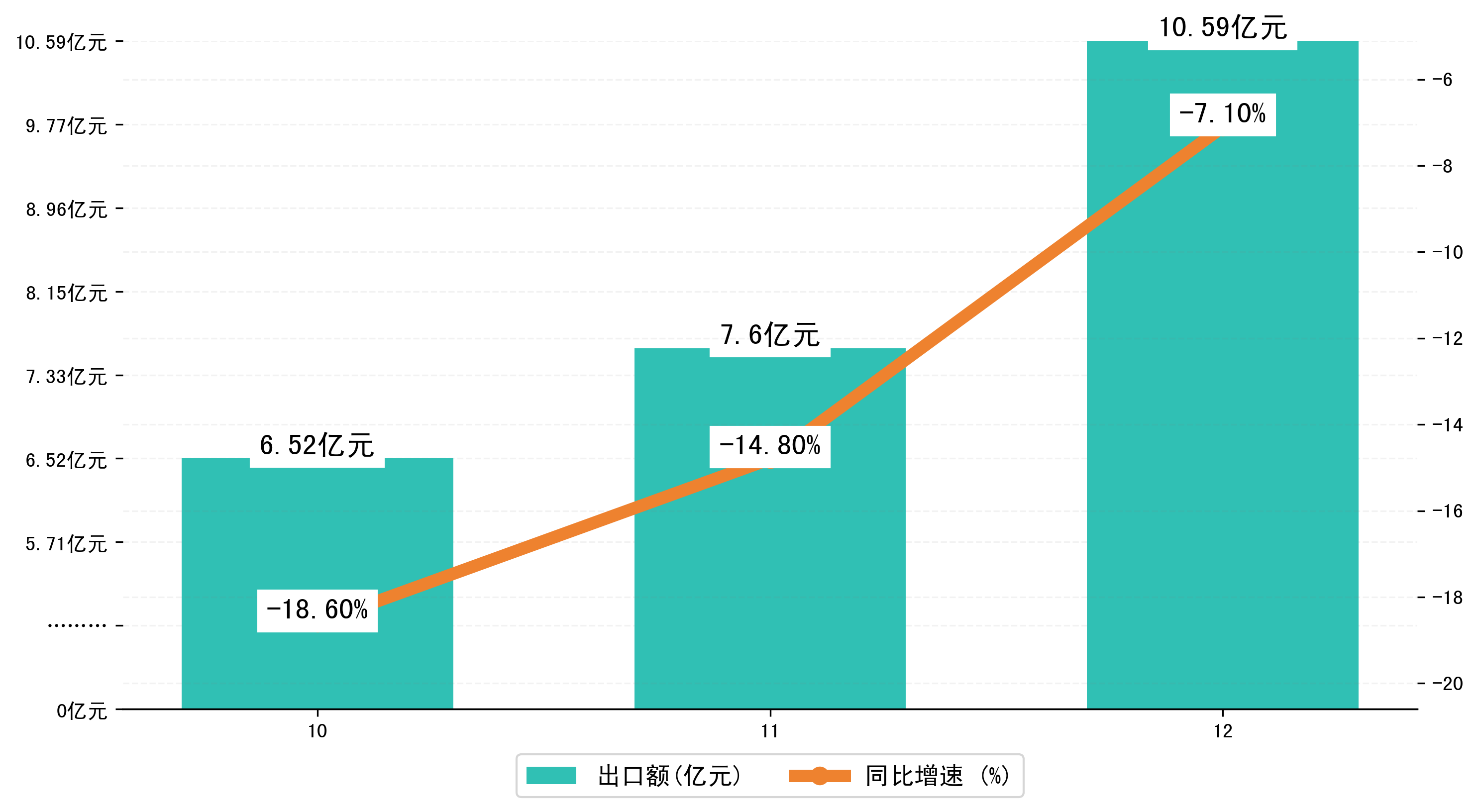 以人民币计,2024年1-12月银川市出口额为81,9106.5621万元,相比上年同期减少了6,3223.3991万元,同比减少了-7.10%。