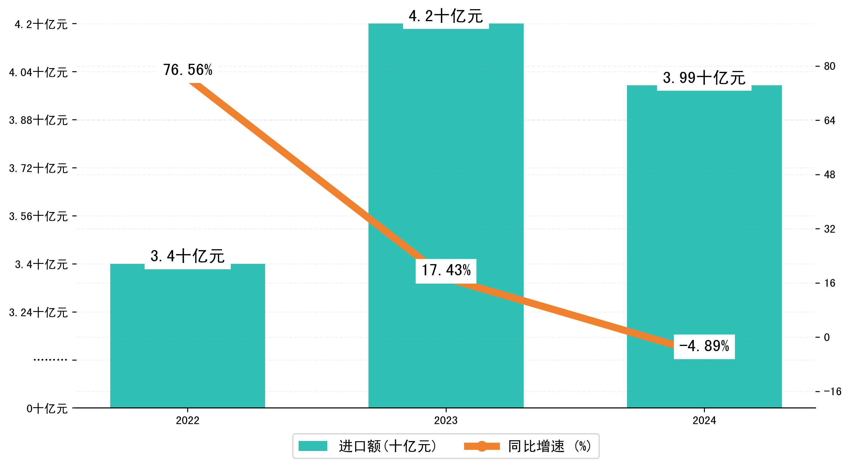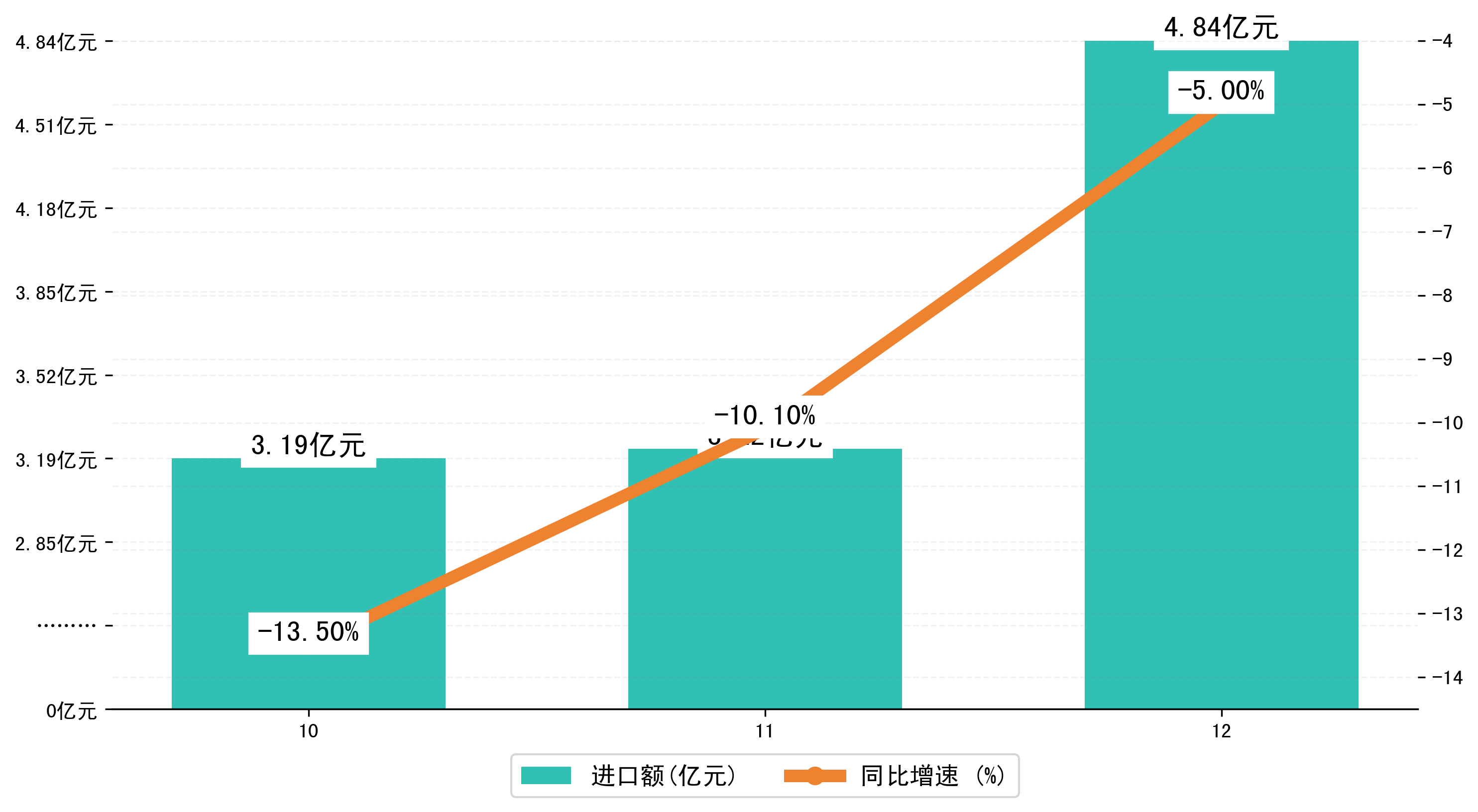 以人民币计,2024年1-12月银川市进口额为39,9127.3728万元,相比上年同期减少了2,0511.178万元,同比减少了-5.00%。