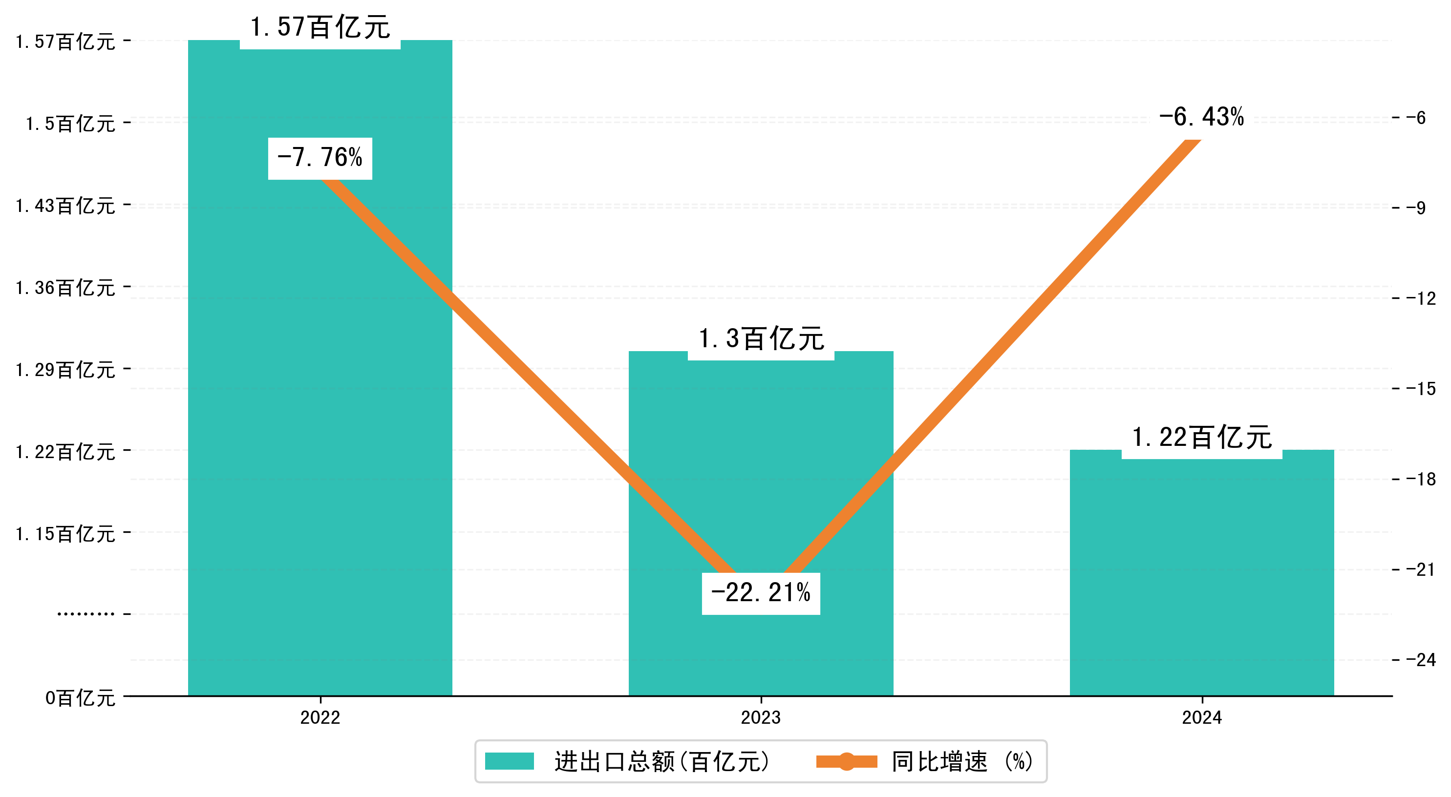 以人民币计,2024年1-12月银川市进出口总额为121,8233.9349万元,相比上年同期减少了8,3734.5772万元,同比减少了-6.40%。