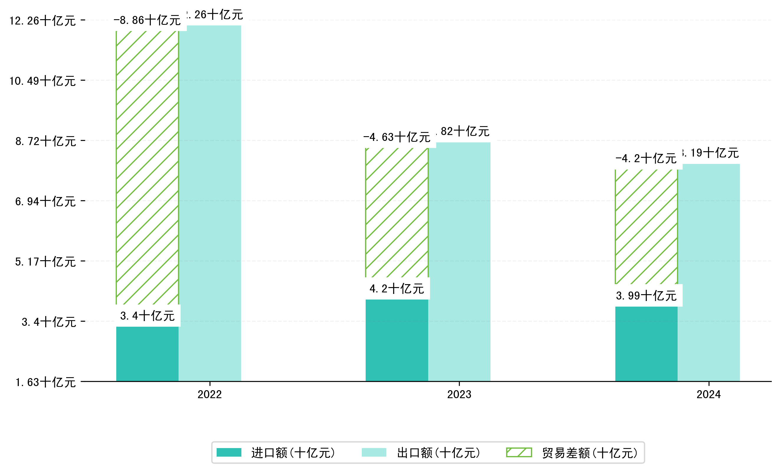 以人民币计,2024年12月银川市贸易差额为5,7456,7857万元(贸易顺差),相比上月增加了1,3746,8927万元,即1835,0502万美元;相比上年同期增加了2,8175,9285万元,同比增加96.23%。