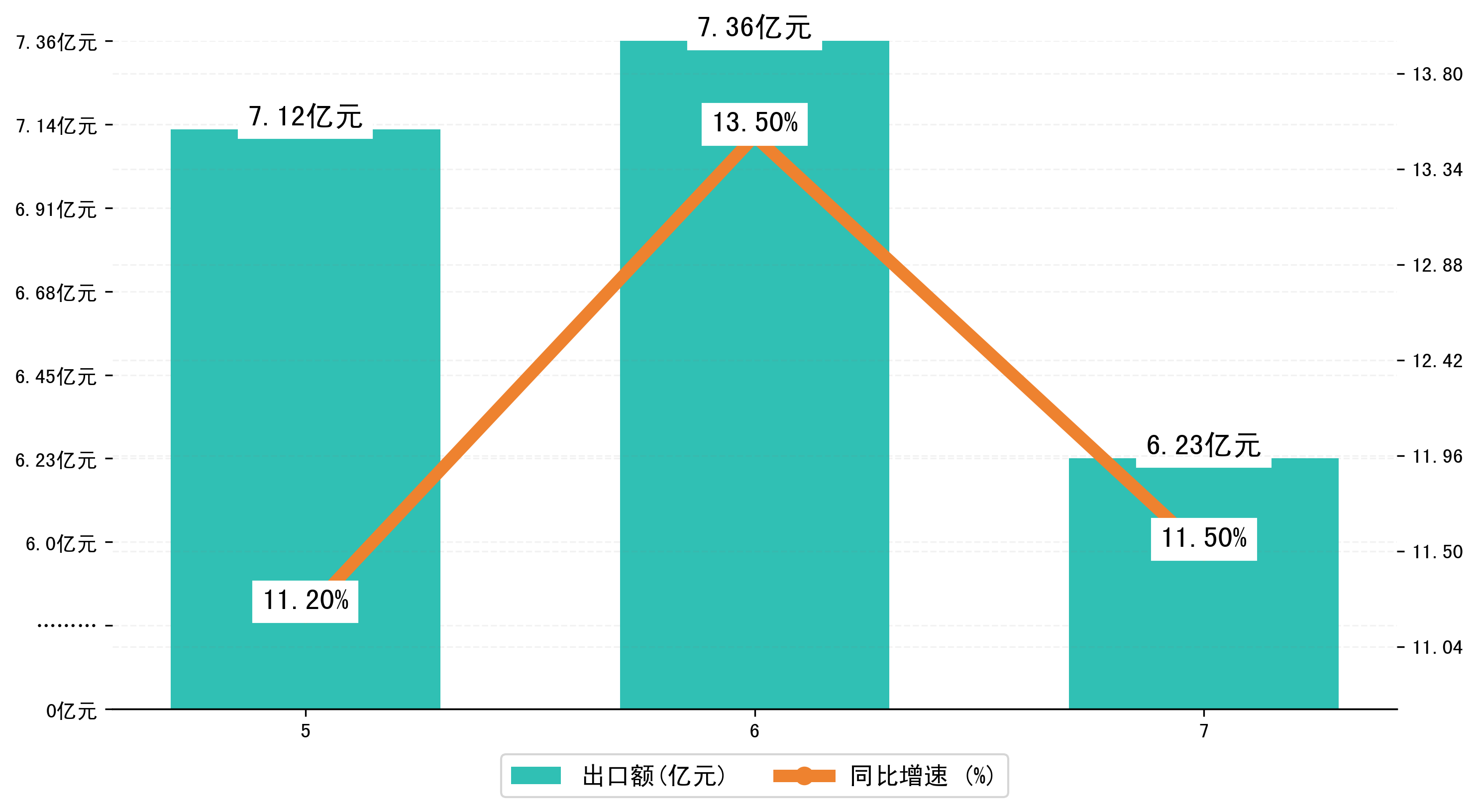 以美元计,2025年1-7月银川市出口额为6,7752.0448万美元,相比上年同期增加了6315.116万美元,同比增加10.30%。