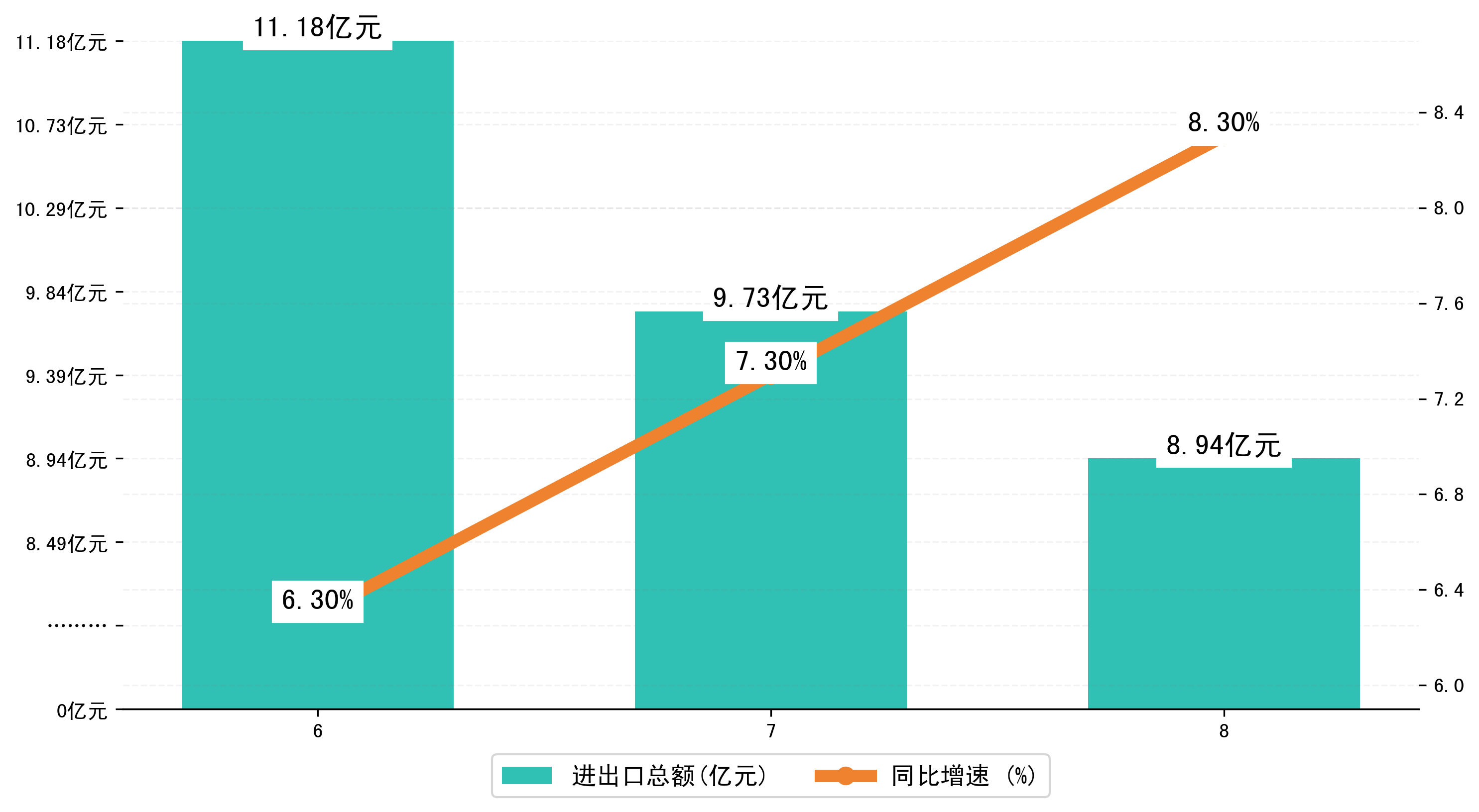 以人民币计,2025年1-8月银川市进出口总额为80,5383.7002万元,相比上年同期增加了6,0626.5805万元,同比增加了8.30%。