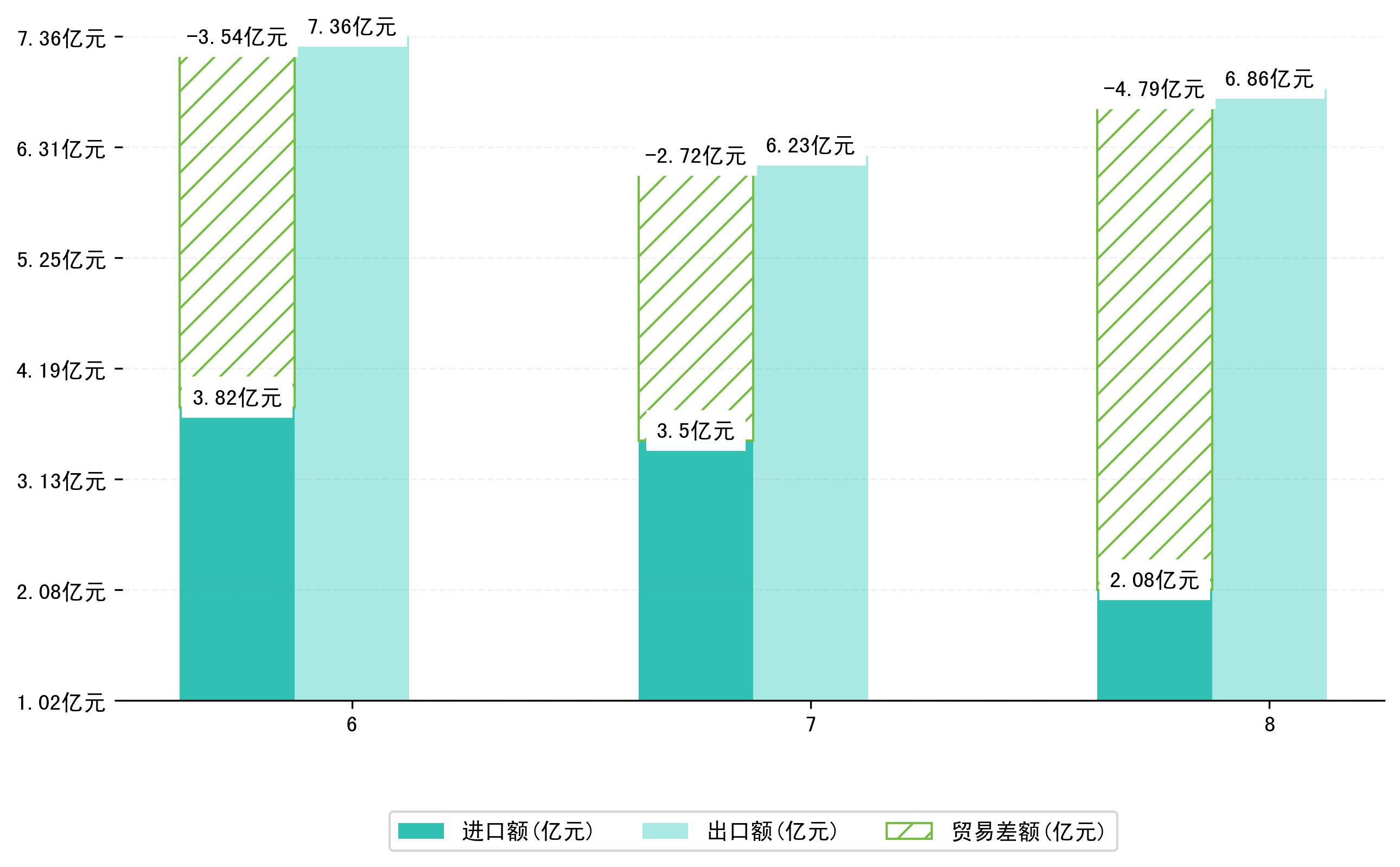 以美元计,2025年8月银川市贸易差额为6702,1477万美元(贸易顺差),相比上月增加了2928,8388万美元;相比上年同期增加了412,4776万美元,同比增加6.56%。