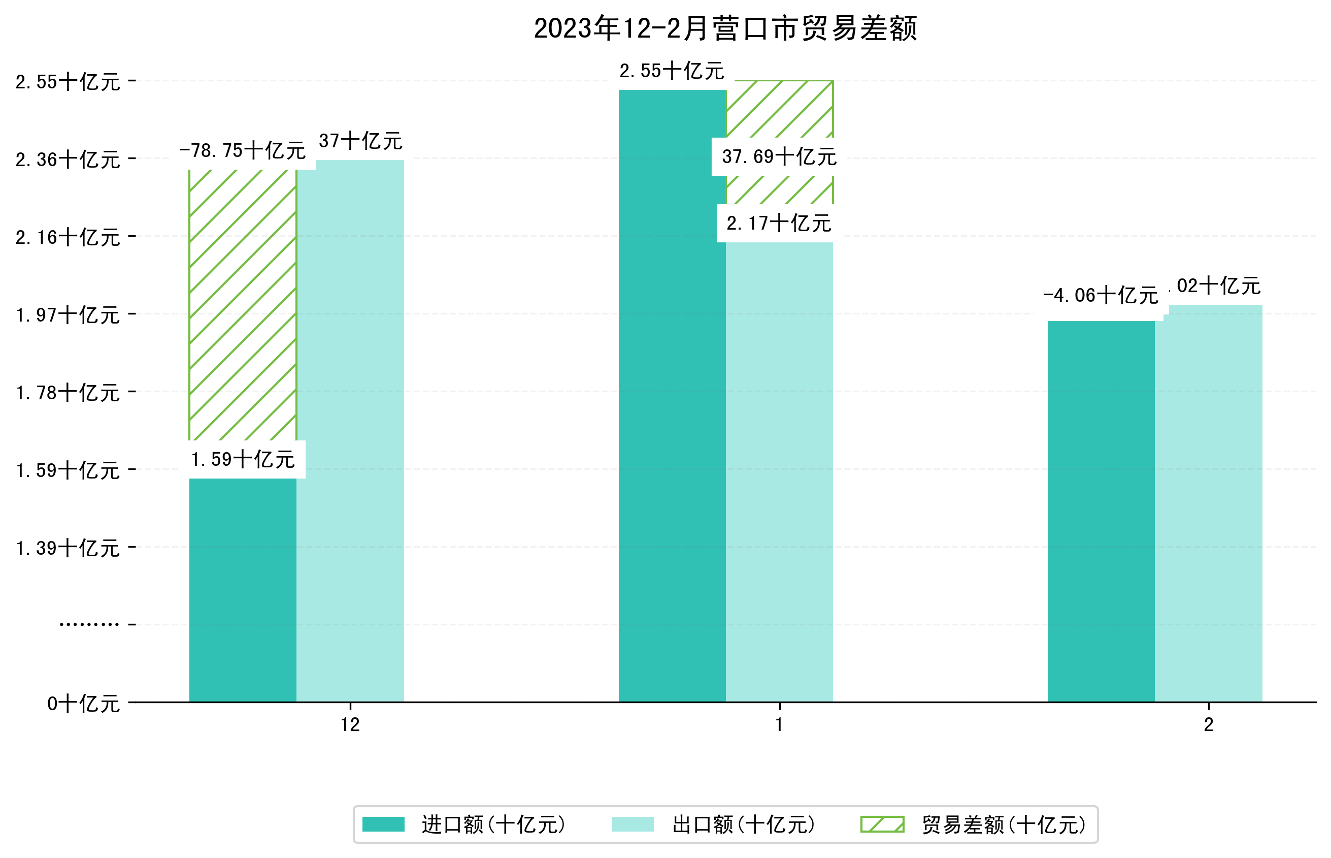 一、2023年2月营口市单月出口总额及进出口差额统计分析
