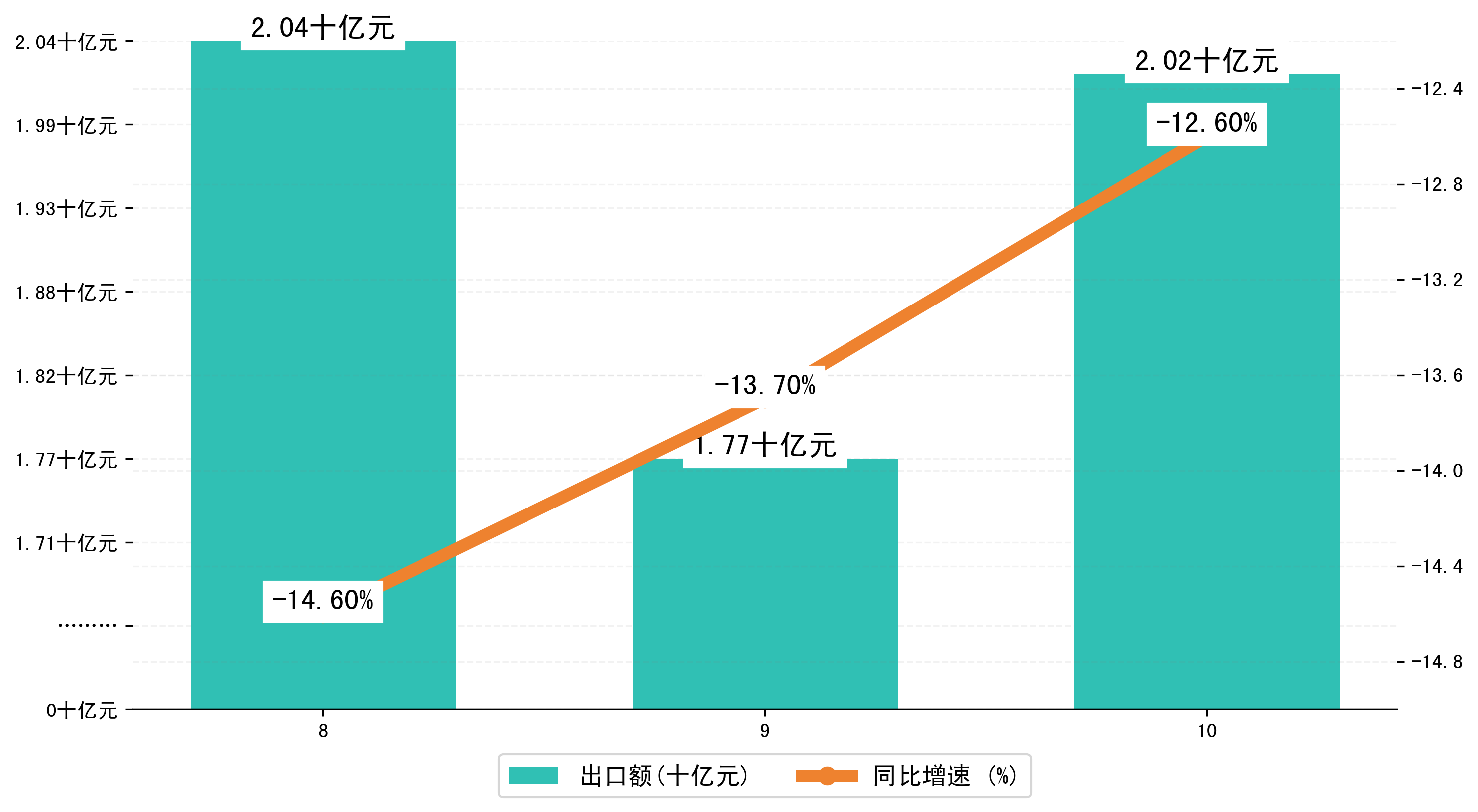 以人民币计,2023年10月营口市出口额为20,2035.9168万元,相比上月增加了2,5329.7864万元;相比上年同期减少了2796.4635万元,同比减少了-12.60%。