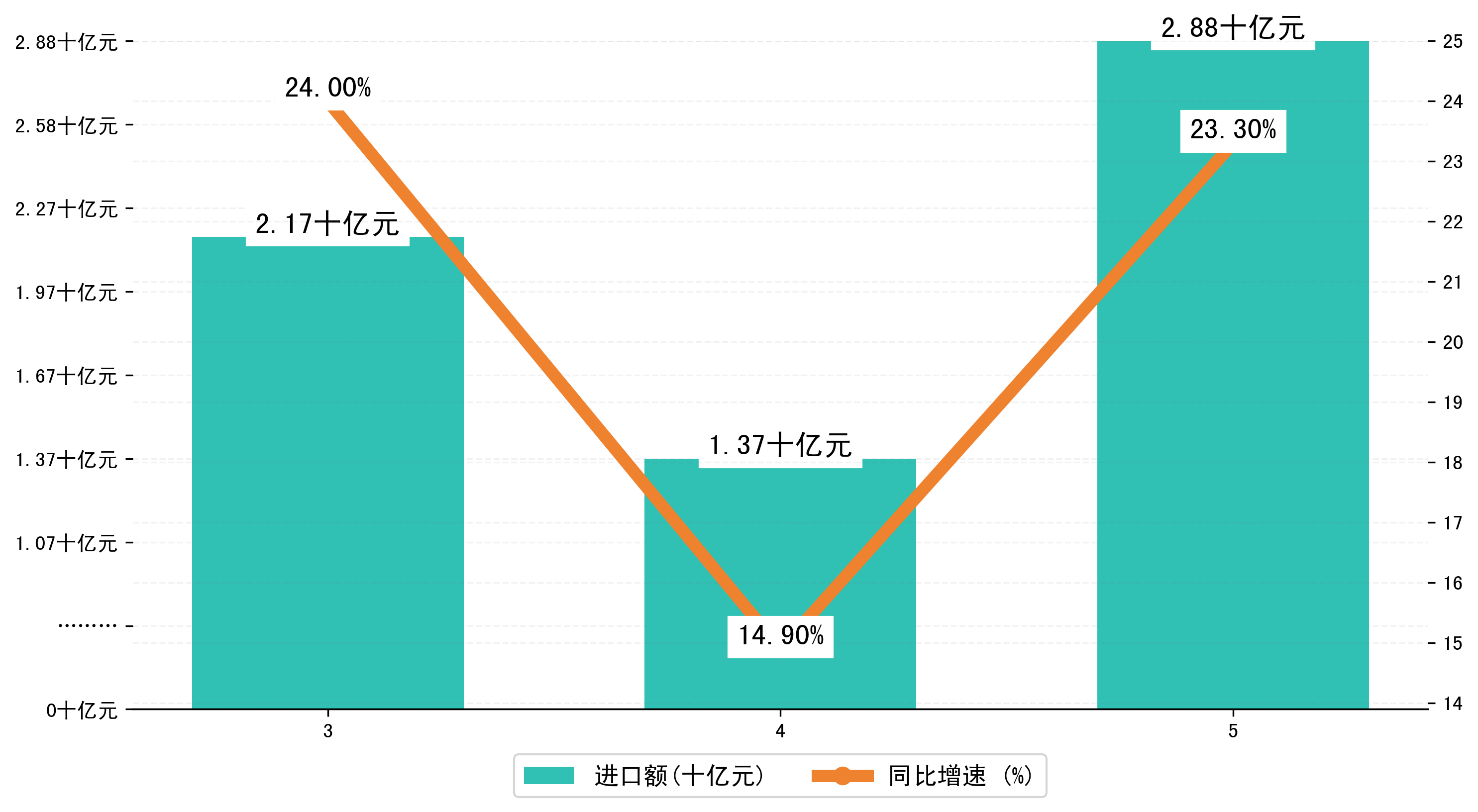 以人民币计,2023年5月营口市进口额为28,7760.7669万元,相比上月增加了15,0882.9368万元;相比上年同期增加了9,5827.9208万元,同比增加了23.30%。